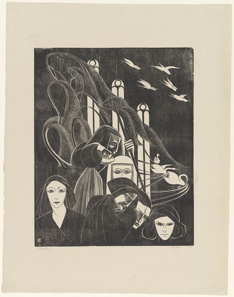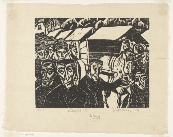 Curator: This woodcut by Dick Ket, titled "Kerkgangers" and dated 1929, presents a striking image of churchgoers. The stark contrasts immediately catch the eye, wouldn’t you agree? Editor: Absolutely. The high contrast creates a solemn, almost ominous atmosphere. The figures seem trapped within these rigid black lines. There’s an unsettling sense of uniformity. Curator: Considering the expressionist style, it is intriguing how the medium of woodcut reinforces this feeling. The labor involved, the act of carving away at the wood block...it's a slow, deliberate process. And consider how many prints could be produced from one block - the endless repetition feels deliberate. Editor: And it’s that feeling of social repetition and pressure that gets me. Are we seeing an insinuation about the societal expectations projected onto the working class during that time? Notice how many faces convey a sense of weary resignation, and it strikes me that Ket may be commenting on the suffocating nature of institutional religion and class conformity. Curator: That’s an interesting take. The rigid, almost crude carving method, creates the opposite feeling for me – like Ket aimed to free himself from the classical and academic artistic restraints. Editor: Well, if we look at Ket’s biography and his social struggles, that interpretation aligns rather well, doesn’t it? As a queer artist working within a rather intolerant, classist social structure, I can imagine it became an act of rebellion of sorts. Curator: I agree. By using such basic means – the woodcut—Ket elevates it to a highly personal expression of discontentment, regardless of how that was influenced. Editor: The sheer materiality – the physical engagement with the wood and the pressure of printing—becomes intrinsically tied to that theme of suppression but simultaneously resisting the establishment. Curator: It all coalesces so intriguingly, doesn’t it? Thank you, that’s definitely helped me to contextualize this piece in a way I hadn’t quite grasped before. Editor: It was my pleasure, I'm always happy when historical contexts meet material explorations in interesting ways.