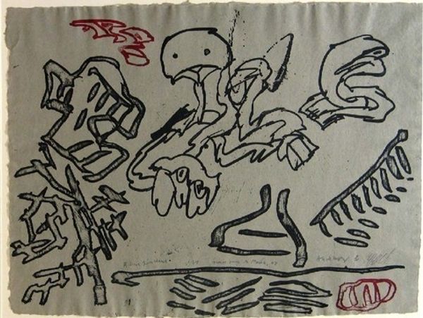 This print was created in the Soviet Union by the collective known as Kukryniksy sometime in the mid-twentieth century, using lithography or a similar process. What’s most striking here is the crispness of the line, which gives the caricature a sense of graphic immediacy. The artists likely used a grease-based crayon on a smooth stone, or a metal plate to create this effect, perhaps taking advantage of new techniques of mechanical reproduction at the time. The choice of printmaking is significant. It suggests a desire to reach a broad audience, disseminating the message of resistance and political commentary widely. The drawing has been enlivened by the integration of red, used to highlight the explosions as well as the Soviet Star, which is suggestive of the political leanings of the artists. The relatively fast reproduction methods, using cheap materials, allowed for mass production of these images to be circulated in print media such as magazines and newspapers. Ultimately, understanding the means by which this piece was made allows us to appreciate its power as propaganda, and also the incredible labor and skill of the artists.