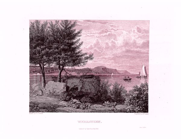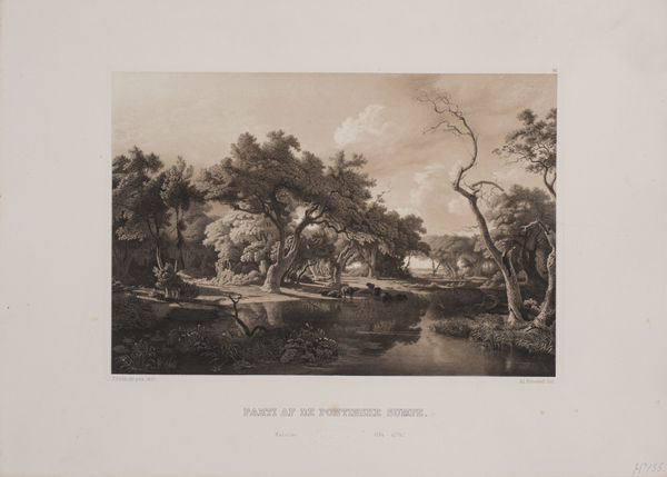 Curator: This is Adolph Kittendorff's "Ved Narni," a landscape etching and lithograph created in the 1880s, capturing a scene of Narni, Italy. Editor: The high contrast immediately pulls me in. The deep shadows juxtaposed with bright highlights really give the landscape a dramatic feel. Curator: Yes, the Romantic style is quite evident. Kittendorff wasn't just portraying a place; he was capturing a mood, emphasizing the sublime beauty of the Italian landscape and its historical resonance, so it's more than just aesthetic. It's about how viewers in the 1880s perceived places steeped in history. Editor: Absolutely. And look how the composition leads your eye from the dark, overgrown foreground, through the open space, right up to the fortified town in the distance. There is a sense of careful placement, a sort of visual dance of the trees, river, and fortress. Curator: It certainly invites the viewer on a journey. Consider that prints like this one were accessible to a wider audience than oil paintings, bringing visions of the 'picturesque' and notions of cultural heritage to middle-class homes. It was about disseminating certain perceptions. Editor: I appreciate your perspective, it really highlights the social context. It makes you question, however, what we tend to focus on. We find so much beauty in landscapes, as the sublime and romantic are naturally tied to how it looks, but how important are all the movements created by man, such as societal and historic movements, when appreciating a scene like this. Curator: Well, art like this both shapes and reflects societal values. How we see it then reflects today's perspective as well. So the appreciation is a continuum through history and not just something in a vacuum. Editor: Interesting how we see things! The formal composition, balanced with such a range of tonal variation, makes for a piece where anyone can get lost in appreciation. Curator: Precisely. Whether it's the aesthetic pleasure or the historical weight it carries.
