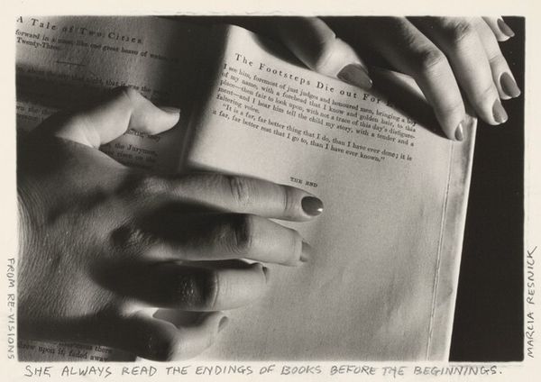 Curator: Lynn Hershman's "Untitled (Roberta’s Signature in Guest Book)" presents us with a photographic image of a guest book opened on a table. Editor: It’s imbued with such quiet melancholy, isn't it? The stark black and white, the half-empty glasses, the open book... a sense of absence hangs heavy. Curator: Indeed. The composition is deceptively simple, directing our gaze to the book itself, its pages holding the trace of 'Roberta' - a fictional persona Hershman adopted. Editor: Roberta, this invented identity, it's fascinating how she becomes a symbol of the self, the constructed nature of identity in modern society. The signature as a placeholder for a life. Curator: Precisely. The photograph then becomes a document, a record of a performance, of this fabricated identity leaving its mark within a very real social setting. Editor: This resonates deeply; it reveals how deeply entwined our sense of self is with the perceptions and projections of others, particularly within the social rituals of 'signing in'. Curator: It is in the contrast between the stark formal presentation and the complex conceptual layering of the image that the artist constructs a compelling interrogation of the authentic versus the artificial. Editor: And what better place to do it than with the iconic symbol of the Guest Book! It has shifted my view of identity, even the signatures I leave behind.