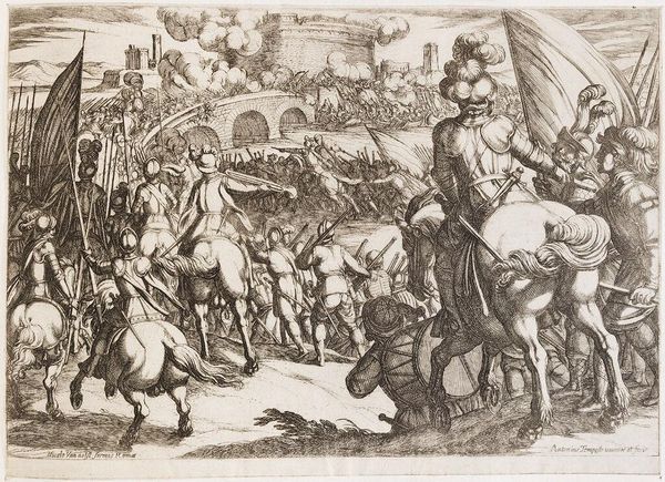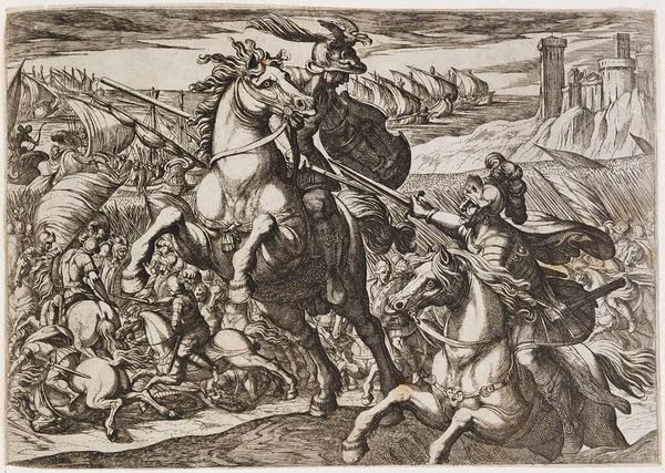 Curator: This is "Cavalry Engagement at Close Quarters," by Antonio Tempesta, an Italian artist who lived from 1555 to 1630. It's quite a whirlwind of action. Editor: It’s so intense! The way the figures are packed together, it’s almost claustrophobic. The horses are rearing, soldiers are falling… it feels like chaos. Curator: Tempesta was known for these dynamic battle scenes. He really captures the ferocity and brutality of conflict. It is, after all, a depiction of power and violence. Editor: Absolutely. And the composition emphasizes that. The tight cropping focuses our attention on the immediate struggle, obscuring any larger strategic context. Curator: Right. It's a perspective that brings us into the heart of the fray. Editor: It makes you wonder about the stories left untold, the human cost of these clashes. Curator: Indeed. It's a reminder that behind every grand historical narrative, there are countless individual experiences of suffering and loss. Editor: And that's something to keep in mind when we view historical art—the silences as well as the spectacle.