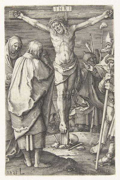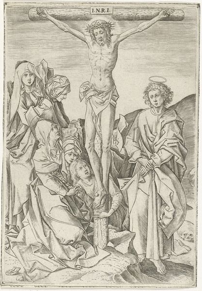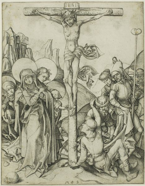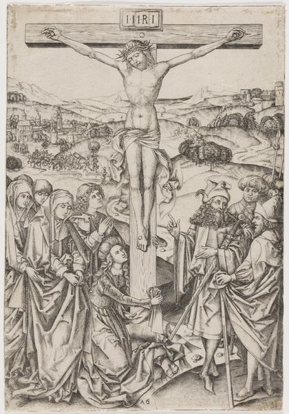 Editor: We are looking at "The Crucifixion," an engraving, created between 1475 and 1490, by the artist known as Monogrammist AG. It's quite moving, with all of the figures arranged around Christ on the cross, full of expressive gestures. What stands out to you about its imagery? Curator: It is indeed a powerful composition. I'm struck by the duality within it. On one side, we see figures of sorrow, of empathy, mourning Christ’s suffering. On the other side, soldiers are present, indifferent. Look at how their weapons stand erect, piercing, aggressive. What emotional contrasts do *you* see? Editor: I see the grief and the almost aggressive nature of the other group…I guess it highlights the human range of emotions during this event, like it is illustrating various aspects of faith... but I do not know if that is really an emotional attribute... Curator: Exactly. Notice also the idealized landscape receding into the distance – almost indifferent to the scene's drama. Landscape in art carries the collective memory of a place, right? What meaning do you think this particular visual shorthand conveys in relation to this story? Editor: Maybe that this specific event is happening in one single point but still relevant universally? As a religious artwork, how does the artist incorporate both local and timeless symbols? Curator: The artist integrates both beautifully. Christ on the cross, a universally understood symbol of sacrifice. Simultaneously, the detailed rendering of garments and faces offers a glimpse into the material culture of the late 15th century. Consider the gesture of pointing… Why do you think Monogrammist AG chose to depict that particular hand gesture and toward what end? Editor: The pointing is almost accusatory, I did not recognize this symbol until now! It makes me reconsider all the figures portrayed on the lower-right... Thank you! Curator: My pleasure!