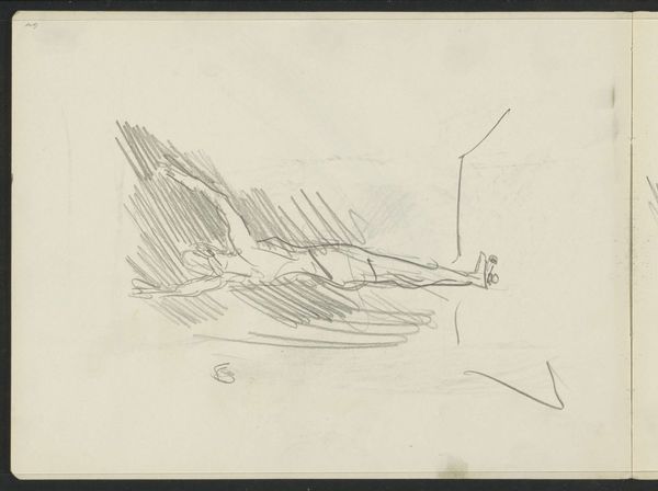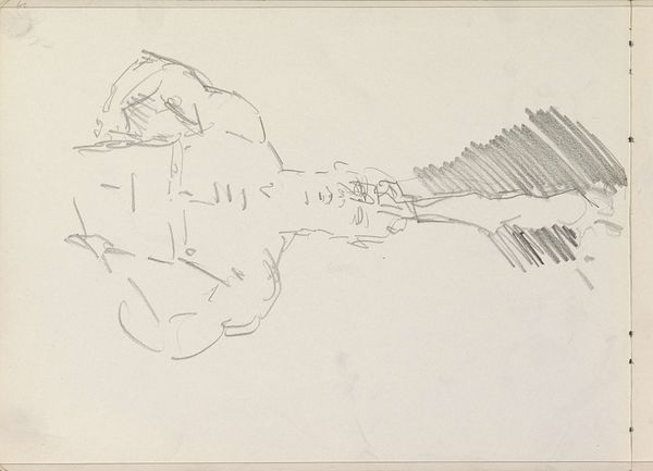 Curator: This intriguing sketch at the Rijksmuseum, entitled "Woman with Hat, Seen From the Back", was created by Isaac Israels between about 1915 and 1925 using pencil. It is an impressionistic work and also appears to be a pen sketch. Editor: My initial impression is that the sketch appears quick and ephemeral. There’s a certain vulnerability to depicting a woman with her back turned, denying us her gaze. It almost feels like an intimate moment captured on the fly. Curator: Exactly. The apparent haste reveals much about Israels's method. Consider the economy of lines, the material reality of the graphite on paper; Israels captures a specific social class. Editor: And isn't that gesture itself telling? To observe, to document, implies a position of power. What's her story? What world does she inhabit in comparison to Israels' position in society? There is, for example, her social standing being visually suggested, via dress. The hat serves here not merely as utility. Curator: Indeed, these sketches showcase his mastery of capturing a mood, a fleeting gesture, an outfit perhaps bought at great cost that still required expert craft and attention in it's physical creation and materials. He gives the illusion of effortlessness while deploying his tools to his subject. The pencil allows a certain immediacy. It allows him to seize moments from modern life for consumption by, most likely, another part of modern life that is the viewing public. Editor: The cross-hatching adds volume to her form, which then begs a consideration of what and whom he chose to monumentalize through the means of his labor? Her apparent affluence becomes, also, a sort of shield between viewer and subject. It raises important questions, also, around voyeurism. It makes me consider our responsibility, and Israel's as well, in seeing this moment. Curator: Well, I think we can all agree that Israels work provides rich insight to ponder the materials and meaning around modern urban existence. Editor: A perfect encapsulation. It forces us to ask how our own perspectives affect our understanding. Thank you.