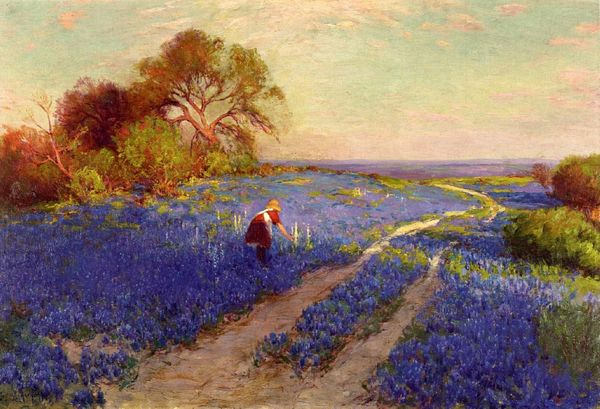 Robert Julian Onderdonk, sometime in the early 20th century, made this beautiful painting of a bluebonnet field. It’s a super interesting painting because it’s both kind of controlled, but also has this really loose, expressive quality. Check out the way the paint is applied. It's not trying to trick you into thinking it's anything but paint. It revels in its own materiality, with thick impasto strokes, especially in the foreground. Look at how Onderdonk created the texture of the flowers themselves. They almost seem to vibrate, the color shifting from darker indigos to lighter, almost periwinkle blues. The path winding through the field is rendered with a more subdued palette. It offers a visual respite from the intensity of the bluebonnets. It’s kind of like he’s saying, “Hey, art is a path, not a destination.” Onderdonk’s work reminds me a bit of Van Gogh, particularly in the way he uses color and brushwork to convey emotion. But where Van Gogh is all about the drama, Onderdonk has this quiet, subtle way of drawing you in.