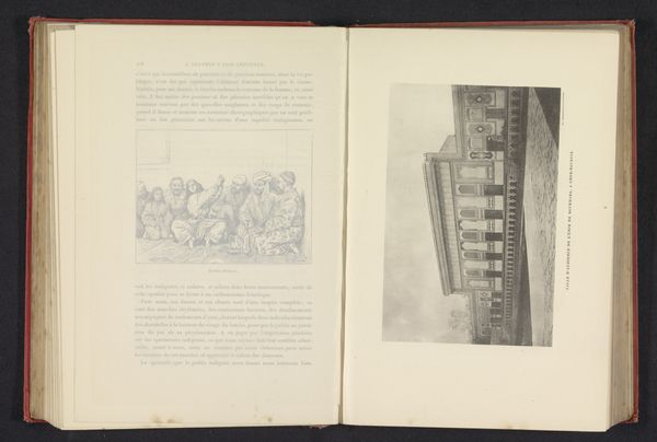Editor: Here we have a print, seemingly from before 1885, depicting a facade of a university in Bukhara. The image itself feels like stepping into a historical novel—grainy, with the architecture imposing and intricate, but slightly softened by age. What stands out to you in this piece? Curator: It whispers tales, doesn’t it? To me, it’s a poignant conversation between permanence and transience. The solid architecture, intended to inspire for centuries, presented within the ephemeral nature of a photographic print. Note how the geometric rigidity of the building plays against the organic texture of the paper – that’s not just age, but intention. This wasn’t mass-produced; there’s a feeling of care, a handmade quality to its creation. Does that feeling come through to you as well? Editor: Absolutely. It feels intimate somehow, like uncovering a hidden treasure in someone's attic. Does the text on the opposing page play a role in your interpretation? Curator: Intriguing question! The opposing text adds layers – suggesting context, perhaps the account of a traveler. It shifts the image from a simple architectural study to a component of a narrative, deepening its sense of time and place. This blending of image and word—it speaks to the power of preservation, doesn’t it? Resisting the inevitable erosion of memory. I can almost smell the old paper! Editor: That's beautiful. It’s making me rethink the power a simple image can hold. Curator: Exactly! And that, my friend, is the magic of art - it constantly reshapes our perspective, reframing our world with new meaning. Now, wasn't that a delicious little journey?