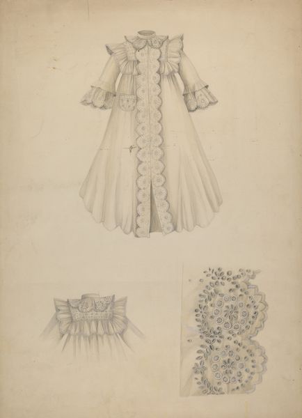 Editor: We’re looking at “Embroidered Dress & Mull Cap,” a pencil and paper drawing from 1936 by Ella Josephine Sterling. It's like a page torn from a seamstress's notebook. It feels both technical and intimate. I'm curious, what stands out to you when you look at it? Curator: Ah, this piece whispers of forgotten skills and quiet hours spent meticulously planning. See how the artist hasn't just drawn the dress but deconstructed it, presenting detailed studies of its embroidered components? It’s almost an act of devotion to the craft itself. Makes me wonder what hands would have brought it to life, don’t you think? Did this vision ever become something real? Editor: It does have that speculative quality! So much care in the details. I also noticed the handwriting with measurements; it makes the artistic intention more concrete. Curator: Yes! It bridges the gap between artistry and functionality. The annotations anchor the sketch to a physical reality, but don’t diminish the aesthetic allure. Do you notice how she plays with positive and negative space, suggesting the fabric's texture through the absence of line? It’s like a secret language known only to textile aficionados! And do you feel a hint of melancholy emanating from the paper? A longing to be embodied by somebody perhaps? Editor: I do. Like looking at a pressed flower, lovely but removed from its context. It makes me wonder about the cultural context of clothing at that time, what it might have symbolized? Curator: Indeed, each stitch probably tells a tale – about its maker, about societal expectation of women, of elegance on the edge of war. Think of what clothes do in our daily lives and what that would mean decades ago. Thank you, that adds a fresh dimension. Editor: Well, thank you! I definitely see more here now, and I appreciate how the artistic value goes beyond just visual appeal. Curator: Likewise! The act of studying craft as art… what could be more worthwhile?