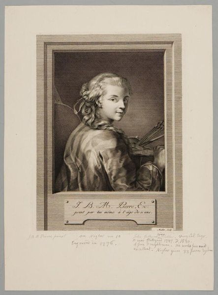Curator: This is "Edelinck" by Gustave Lévy, currently housed at the Harvard Art Museums. The stark contrast immediately creates a powerful sense of formality, doesn’t it? Editor: It does! I'm struck by the wig. It practically glows, a cloud of white against the darkness. I wonder about the weight, the texture... Curator: Exactly! Consider the cultural significance of such attire. The materiality speaks volumes about status and labor, both visible and invisible. Editor: Yes, it’s a costume, a performance of power. But there's also a vulnerability in the subject's eyes that complicates the whole picture. Curator: Fascinating. It suggests the tensions inherent in the production of identity through material means and social constructs. Editor: It's more than that. It's about seeing the person beneath the artifice, even for just a moment. Curator: An interesting perspective, hinting at the complexities of analyzing portraits. Editor: Indeed, a dance between the visible and the felt, always.