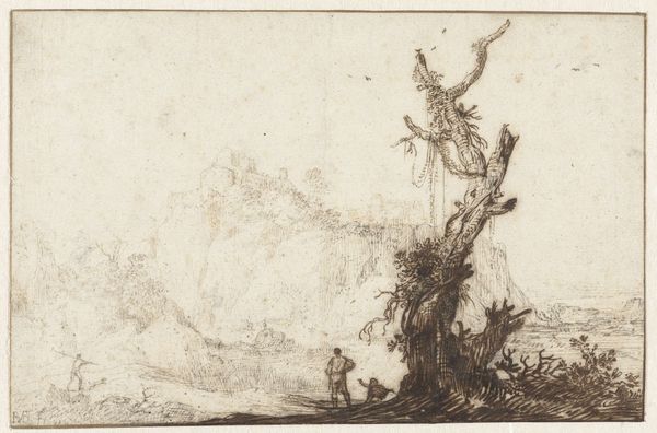Jan van Goyen’s sketch, created in the Dutch Golden Age, portrays a stark scene of bare trees along a path, rendered with simple strokes in pen. Trees, often symbols of life and growth, here appear in their dormant state, evoking themes of mortality. Consider the symbolic weight of trees throughout history, from ancient mythologies where sacred groves were sites of spiritual communion, to their depiction in Renaissance art as symbols of paradise. The absence of leaves shifts this imagery: bare branches reach like skeletal fingers. We can see how such imagery later emerges in the desolate landscapes of Romanticism, reflecting an inner emotional state. Perhaps van Goyen's trees also speak to the cyclical nature of life, a reminder that winter's barrenness always gives way to spring's renewal. The barrenness we feel when looking at the trees engages our sense of memory and anticipation. This simple drawing serves as a poignant reminder of the complex interplay between nature, emotion, and the symbols that connect us to a deeper understanding of existence.
