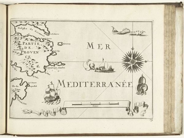 This is an anonymous map of the French southern coast near Toulon, created around 1702. The stark contrast between the stark black lines and the pale ground immediately draws the eye, producing a dramatic sense of depth and clarity. The composition is anchored by a compass rose, whose radiating lines point in all directions, mirroring the geographical scope of the map itself. The strategic placement of labels and toponyms guides our reading of the image. Note how the land masses are densely inscribed, while the sea remains open and largely unmarked, except for the depiction of several ships and stylized waves. The map engages with prevailing notions of space and power. Through its emphasis on coastal features and naval activity, the map underscores the importance of maritime control for both trade and military dominance. Consider how such maps were not merely descriptive tools but also instruments of political strategy, designed to shape perceptions and assert territorial claims. It offers us a glimpse into the era's geopolitical landscape.