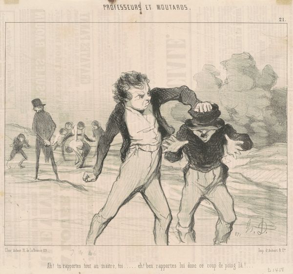 Curator: Hippolyte Bellange created this ink and graphite drawing titled "Social Vignettes" around 1830. It’s a fascinating document of everyday life rendered in a Romantic style. What's your first take? Editor: There’s an air of playful social commentary that strikes me immediately. The figures, rendered with such delicate lines, are almost caricatures, exaggerating certain traits and suggesting a hidden story behind each individual depicted here. Curator: The choice of ink and graphite on paper lends itself to the almost sketch-like quality. It wasn't intended as a grand statement piece, but rather a record, a snapshot of a moment. These "vignettes" seem to highlight social types and perhaps, hint at emerging class distinctions in post-Revolutionary France. We see the soldier, the bourgeois couple, children... Editor: Right. That soldier, burdened with his gear, represents more than just a figure in uniform; he embodies duty, perhaps even the human cost of constant conflicts that shaped that era. And beside him, that couple – their posture and dress speaks volumes about their social standing and values, don’t you think? The woman carrying the bandbox indicates the increasing consumer culture. Curator: Absolutely. Bellange was keenly aware of the societal shifts occurring. This wasn't a commission for a wealthy patron, it was closer to reportage, achieved through readily available materials and a swift, practiced hand. The technique, pen and ink, allowed for reproducibility; this artwork lends itself to becoming prints, disseminated widely for commentary. Editor: Consider the horse rider, positioned almost like an afterthought – that can symbolize the freedom of movement and social standing compared to the struggling soldier or laborers lower in the composition. Each image speaks to larger concepts, a complex interplay of symbolism that engages on different levels. It acts as a time capsule of cultural anxieties and aspirations. Curator: Indeed, we are witnessing a moment in time rendered via accessible mediums and materials, portraying people in society also rendered vulnerable to time and circumstance. Editor: It reminds us how art, regardless of the means, allows us to access a past otherwise forgotten. These symbolic snapshots crystallize social history.