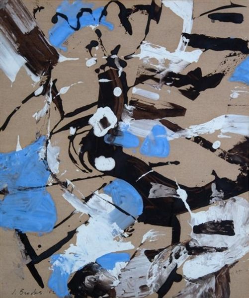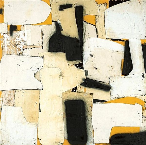 Conrad Marca-Relli created "Summer Rain J-L-11" as an abstract piece with layers of shapes and colors. The composition is structured into three horizontal zones, with the top being the darkest and the bottom, the lightest. The artist uses the collage technique to build the surface. Marca-Relli's work destabilizes traditional notions of painting by incorporating collage, challenging the boundary between painting and sculpture, and undermining the illusion of depth typically found in painting. The interplay between the shapes creates a push and pull, with no clear focal point. The textures of the collaged elements add another layer of complexity. The dynamic between the flat planes of color and the spatial depth suggested by the collage elements creates visual interest, engaging with mid-20th century debates about the nature of painting. It invites us to reconsider how we perceive space and form in art.