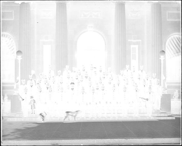 Curator: This intriguing, untitled photograph by Hamblin Studio captures a group portrait of uniformed firemen. It’s part of the Harvard Art Museums collection. Editor: The crisp uniformity immediately strikes me – a powerful image, almost ghostly, due to the negative's high contrast. It's a statement about order and civic duty. Curator: Absolutely, the firemen's uniforms function as symbols of public service and collective identity. It really speaks to the cultural memory of firefighters as pillars of the community. Editor: I'm drawn to the material reality – the photographic process itself, the darkroom labor, the standardization of their attire and even their poses. A very stiff formality. Curator: And there's a curious ritualistic aspect too, a frozen moment commemorating their service, almost like an icon of civic responsibility. Editor: It certainly makes you consider the role photography played in shaping public perception of these civil servants. A very intriguing record. Curator: Agreed, a reminder of shared values, and a fascinating visual symbol of community. Editor: Yes, it makes me think about the industrialization of heroism and the social dynamics it depicts.
