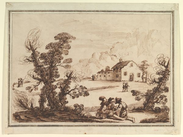 Curator: This is "Landschap met een muurfontein," or "Landscape with a Wall Fountain," an etching made by Charles de Hooch sometime between 1610 and 1638. Editor: Huh. Sort of a spooky, post-apocalyptic vibe, right? I mean, there's this imposing structure that looks half ruined, figures milling around, and this... elaborate fountain sort of just plopped in the middle of everything. I get a melancholy sense, as if I should brace for some kind of bad news. Curator: The artist was working during the Baroque period, a time heavily shaped by the Reformation. You see some strong examples of detailed line work to construct an elaborate view of the past. Etchings were readily accessible at the time and allowed for wider dissemination of particular landscapes or biblical settings that shaped a sense of community and identity. Editor: Interesting! That idea of community reminds me how tiny the figures are in relation to everything else, totally dwarfed by this abandoned space. But then the fountain itself feels a little whimsical... I imagine some mischievous forest sprite tinkers around with it after dark. Curator: Fountains were, of course, status symbols—statements of wealth, sophistication and control over nature. Positioning it here might evoke a kind of commentary on the transience of those earthly powers. Editor: It does feel weirdly out of place. A beautiful ruin made useful once again as a humble water source. The whole scene is beautiful yet so quiet and... static. But look closely. It's filled with small dramas, from a crumbling castle, to some walking men, even this improbable fountain gushing in the foreground. Curator: I find myself dwelling on the relationship between human creation and the natural world depicted. And like a painting of the period it directs the audiences towards moral issues regarding civilization. Editor: True, it makes you think about how fragile human achievements really are. Well, this one's definitely given me plenty to chew on... like where I can find my own woodland fountain, hopefully, sans apocalypse. Curator: A reflection, indeed, on how art can reflect, influence and shape societal views, as we each seek solace and understanding in these landscapes of yesterday.