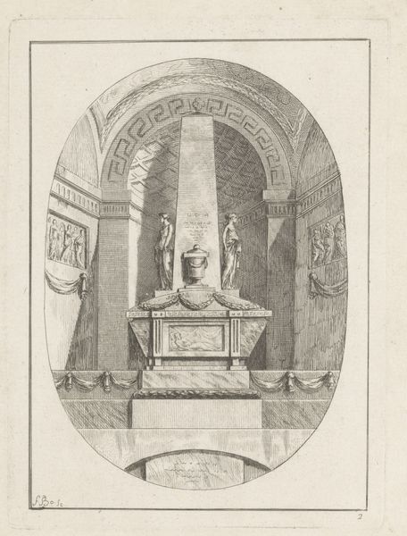 Claude-Antoine Littret de Montigny created this etching titled 'Tombe met fakkels en vaas', or 'Tomb with torches and vase' using paper and ink. At first glance it appears to be a classical, architectural drawing, perhaps even a study for a funerary monument. But the presence of the torches and vase signal something deeper. We see symbols of mourning but also hints of immortality and commemoration. Engravings such as this one circulated widely and played a crucial role in shaping aesthetic tastes and influencing design in architecture and the decorative arts. They also capture the cultural preoccupations of their time, including the veneration of the past and the desire to preserve the memory of individuals. The tombs and monuments depicted in these prints were potent symbols of social status, cultural identity, and historical memory. As we observe this idealized tomb, let's reflect on how societies choose to remember their dead, and how the artistic representations of these memorials both reflect and shape our understanding of life, death, and legacy.