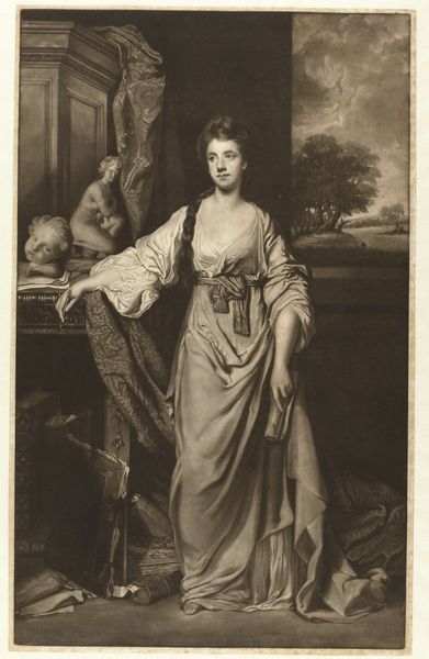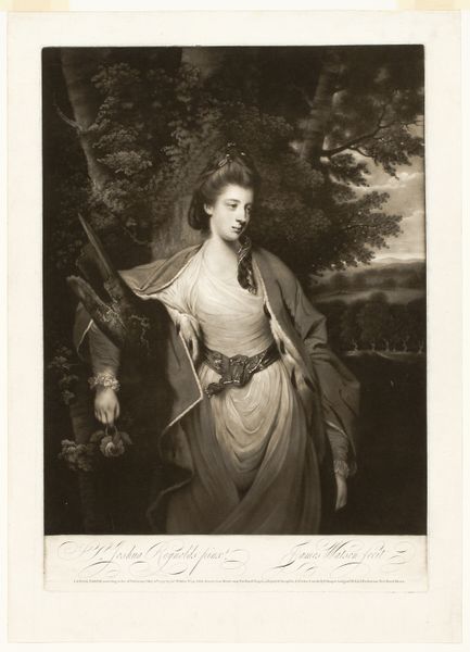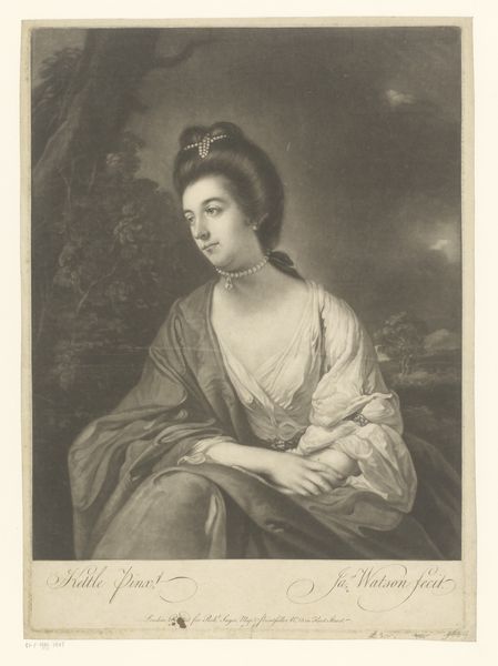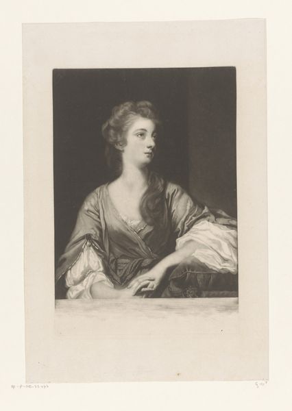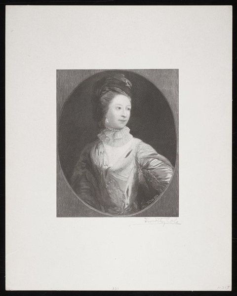 Editor: So, this is Timothy Cole's "Mrs. Somerset Davies," created in 1898. It's a wood engraving print. I’m struck by how the image feels both classical and slightly…ghostly, perhaps because of the monochrome palette. What can you tell me about this piece? Curator: Well, placing it within its historical context, we see Cole working within the late 19th-century printmaking revival. Prints became increasingly accessible. How do you think this shift affected the art world and its relationship to the public, especially in relation to portraiture? Editor: It allowed for wider distribution, right? More people could own a version of this artwork even if they couldn't commission or afford an original portrait. Curator: Precisely. It democratized the image, to a degree. This portrait, originally painted by Thomas Gainsborough, was recreated via a wood engraving. Consider how Cole’s role as an engraver shapes his own interpretation. Do you see any particular artistic license he might have taken? Editor: It's very detailed. And while it feels…reproduced, Cole also infused his unique touch to the portrait by translating the textures to print. Curator: Absolutely. Think about the societal expectations imposed on women in portraits during this period, and consider how those ideals might have been perpetuated, or even subtly challenged, through printed reproduction. How do museums impact access today? Editor: I guess museums are another place for folks to experience it directly, albeit still a mediated access with rules and contexts of display to it. Thanks for breaking it down! It gave a great overview! Curator: It's vital to think about what gets amplified in different eras. Reflecting on Cole’s engraving through a historical lens sheds a fascinating light on art, society, and power.