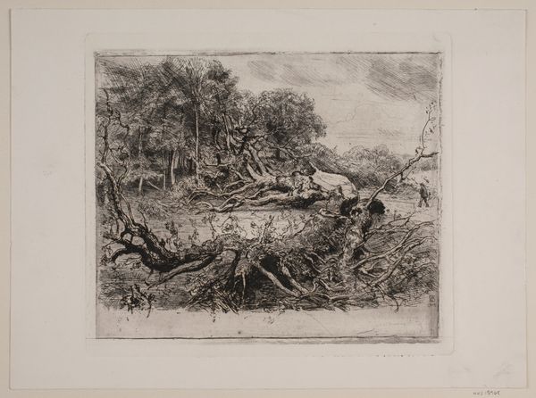 Curator: What a fantastically overgrown corner of the world! A dark pool reflecting the weight of the trees. Like a fairy tale…or maybe something a bit grimmer? Editor: Absolutely. And the Rijksmuseum is our home for this particular fairytale. We are looking at an etching and drawing by Martinus Antonius Kuytenbrouwer jr. made around 1853. It's titled "Boslandschap met een beek", Forest Landscape with a brook in English. Curator: An etching! That explains the texture. All those delicate scratches to build up the shadows. See how the trees lean in? It's almost claustrophobic. Like the forest itself is breathing. There's this very tiny person or figure barely noticeable beside the pond - very Romanticist I think. Editor: I do see that figure you speak of. Considering Romanticism does love its melancholic wandering souls... More broadly, though, I notice the realism, in a very Dutch way. It captures the feel of a specific place and light. These intricate, dark webs. The artist seems obsessed with these dark, natural cathedrals. Curator: It reminds me how our anxieties or aspirations often get tangled up with depictions of the wilderness. Take those leaning trees, for example. It’s as if their branches and their trunks bear the burden and anxiety of nature's secrets, if I dare be overly symbolic. Do you also feel some melancholy in it all? Editor: Melancholy, definitely. But maybe something else too. The density of the lines almost feels protective. A visual representation of feeling safe within the embrace of nature. You can almost feel how time goes slowly within it. What is left of this man after all this time, with this forest forever remaining. Curator: Fascinating, both interpretations coexisting within the same work! That's the power of great art. A conversation that never ends! Editor: Indeed! An invitation to discover our own boslandschap in its reflective stream.