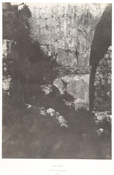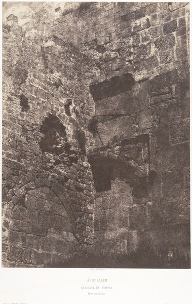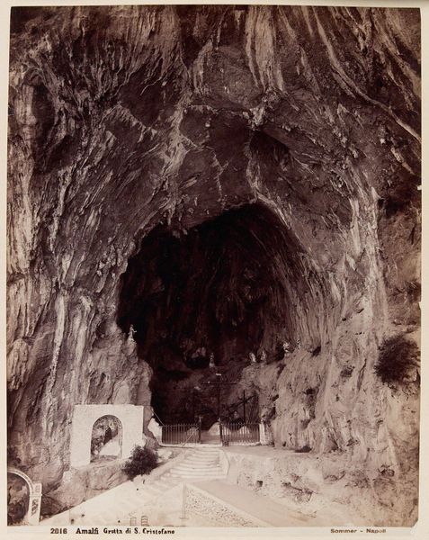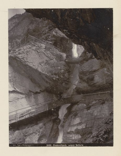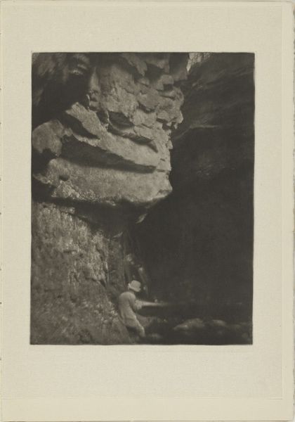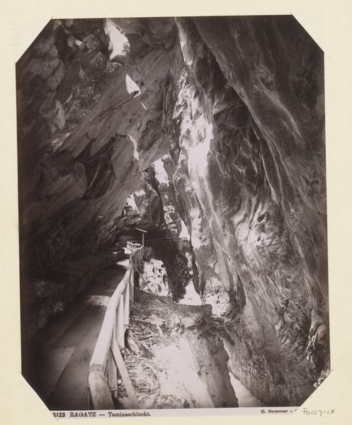 Editor: This is "Cañon of Kanab Wash, Looking South," a gelatin-silver print by William Bell, created in 1872. The canyon walls look almost monumental. What stands out to you? Curator: I observe primarily the interplay of light and shadow which articulates the geological forms. Consider the apex in the upper left—the darkened overhang versus the illuminated cliffs opposite. The photograph creates a powerful sense of depth. Do you notice how the varying light exposure segments the plane? Editor: Yes, the light definitely pulls my eye to the back! I suppose I am drawn to that contrast. What does that suggest? Curator: Precisely. Light’s agency divides the landscape, almost creating visual layers within a presumably unified physical space. Bell is using photographic tools—chemical and optical—to reshape this image into a composition defined by contrasts and spatial recessions. He doesn't simply record the scene, but rather, crafts it. Editor: That's an interesting take! It highlights how much of the artist is in the work, even in a photograph! Curator: Indeed! It pushes beyond a mere reproduction. Note also that this push-pull is enhanced by the monochromatic scheme. This photograph presents tonal values absent of colors, foregrounding forms and textural detail, from the rough, immediate rock face to the softly lit backdrop. These values provide another kind of structural layering. Editor: So you're saying Bell uses both light and the grayscale to give us a composition, more than just a snapshot. I never would have looked at it that way! Curator: Visual perception is not innate; we refine it through practice. Understanding an image’s structural elements enables us to observe what the lens, light, and developer articulate when strategically aligned by an artist such as Bell. Editor: Right, this has given me a whole new framework for looking at photography and its components! Curator: Glad to be of assistance! Now consider, how would our perspective alter should color enter this equation?