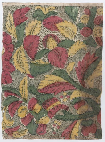 Editor: We're looking at a small print titled "Small sheet with overall floral pattern" from sometime between 1775 and 1875. It’s by an anonymous artist and housed here at the Met. It reminds me of something you might find in an old botanical book, only… folkier. What draws your eye in this piece? Curator: Oh, absolutely! It vibrates with this…honest, homespun energy. The colour palette – that muted pink, the deep greens and reddish browns – it evokes a sense of simpler times, a kind of hand-crafted charm that predates mass production. But it’s also bolder than a simple botanical study, isn't it? Like someone’s dreamt of a garden rather than drawn one. Does it make you think of anything else? Editor: It does! It looks a lot like a pattern you might see on textiles, so a fabric swatch almost? Is that what it could be? Curator: Precisely! Consider how these were probably used. The artist would’ve been designing patterns for textiles and wallpaper using small repeating units and printing technologies of that period. Those ‘flaws,’ like the slight inconsistencies in the registration of colors and the little bleeds, contribute so much character, don't you think? I find that they really reveal the human element so often missing today. Editor: That’s so interesting! I hadn’t thought about the printing process adding to the charm. Curator: Absolutely! These weren’t meant to be high art, but rather decorative, functional pieces for everyday life. The beauty is often in their accessibility, you know? They democratize art. And I imagine our anonymous designer smiling quietly in their studio… bringing beauty into the world, one floral motif at a time! Editor: That completely changes my perspective! It’s not just a pretty pattern, but a piece of everyday history. Curator: Precisely! Each impression offering a subtle story if you pay close attention.