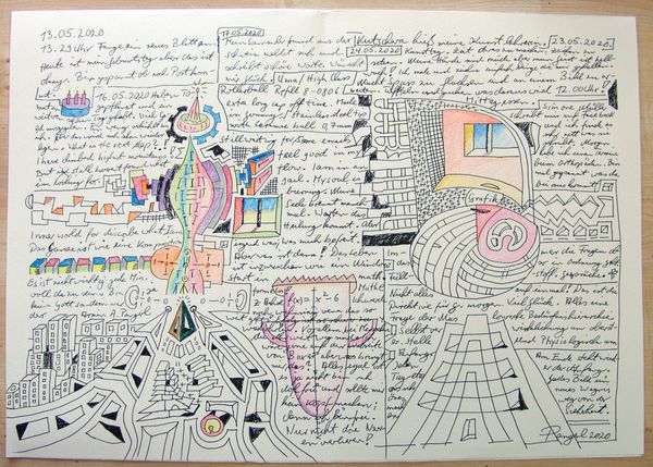 Curator: Look at this drawing, "Nr 18," made in 2020 by Armin Andreas Pangerl, using mixed media, ink, and primarily on paper. It strikes me as an exploration of abstraction and calligraphy. Editor: It's busy, almost chaotic! The linework feels like it’s trying to contain something bursting to get out. There’s this playful, almost childlike use of color popping amidst all the serious ink strokes. Curator: I see that. Pangerl seems to be building worlds on paper, a mashup of hard-edged structures contrasted with fluid text. There are personal writings mixed with visual elements. You see blocks of blue, red and green colors as counterpoints for example. Editor: Right, the written parts. Are those diary entries intertwined with cityscapes? It makes you wonder what his day-to-day was like at the time. The blend feels so… intimate. It reminds me of automatic writing, allowing the unconscious mind to take over. Curator: That's interesting because when we analyze the context in which this piece was created, that stream-of-consciousness element might tell us a lot about the experience of confinement. You sense the tension, the anxiety, but also the creative release the artist finds in breaking free within these self-imposed borders. Editor: Borders, absolutely. It's all about the interplay between control and chaos. Even the simple forms like houses or buildings are so complex, drawn over and over with the words. I guess, like a mind under pressure, a locked box of emotions that wants to explode. Curator: There's such rawness to that honesty. The way he layers text and image, the sense of urgency, all point to artmaking as a way of making sense during times of intense stress and change. Editor: You know, diving deep into this piece, you begin to recognize echoes of ourselves within it. We see our own hidden anxieties and yearnings represented here. It goes beyond art, maybe a portrait of ourselves? Curator: It definitely gives pause to reflect. I find that "Nr 18" invites us to appreciate both the planned structures in our lives, and our scribbled lines where we draw connections that shape meaning.