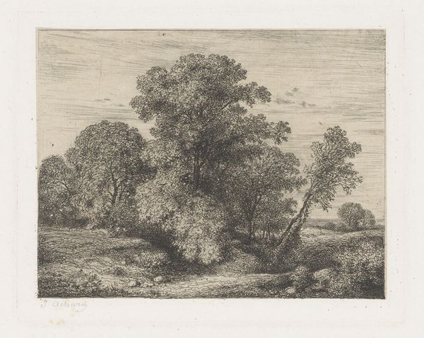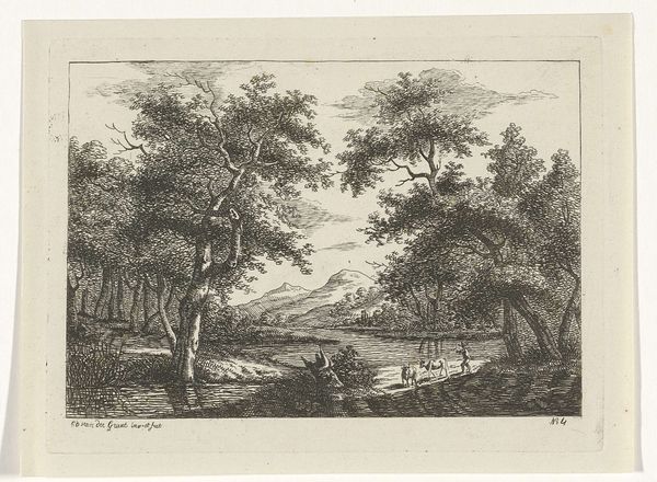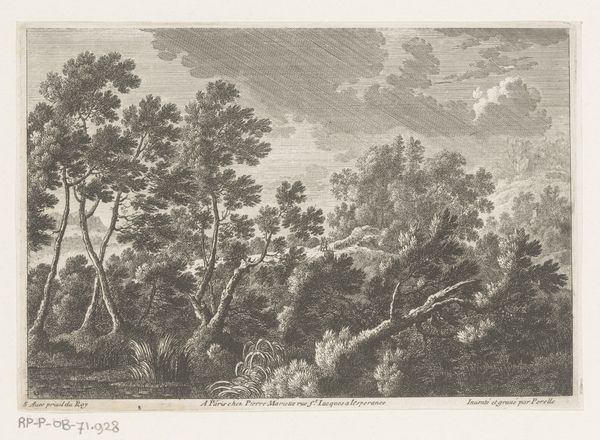 Ignatius van der Stock created "Bos," an etching, sometime between 1660 and 1760. What immediately strikes us is how the composition leads the eye, directing our gaze through a dense woodland clearing to a distant horizon. Van der Stock's use of etching to create contrasting textures captures the interplay of light and shadow, and transforms a natural scene into a rich visual experience. The lines become more than just descriptive; they begin to evoke a sense of depth. The artist uses the structural interplay of dark and light to create a semiotic system of visual information and to suggest forms and spaces. The composition, dominated by the framing of trees, invites the viewer to consider the relationship between the observer and nature. It is an invitation to look deeper into how we perceive and structure our understanding of the world. The etching is not simply a representation of trees, but a carefully constructed visual language designed to engage us in the very act of seeing.