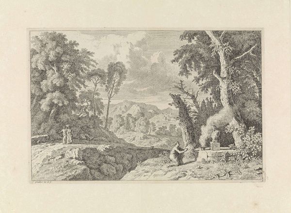 Editor: Here we have Ferdinand Kobell's "The Path in the Rocks." It's a detailed landscape print, but what strikes me is how the figures almost disappear into the scene. What's your take on how this work reflects its time? Curator: Well, considering Kobell's lifetime, we see a visual echo of Enlightenment ideals, where nature is both a site of scientific observation and sublime experience. Look at how the distant city is dwarfed. Editor: Right, the city almost seems insignificant! Curator: Precisely. This challenges the established hierarchy, inviting viewers to prioritize the natural world over urban centers and established power structures. What does that suggest about the intended audience and their values? Editor: It makes me think they valued exploration and maybe a retreat from societal norms. Curator: Exactly. We've both found a richer appreciation of Kobell’s historical context through the visuals.