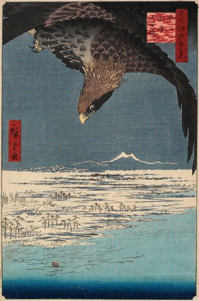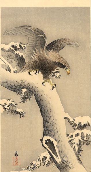 Kawanabe Kyōsai created "Eagle Attacking Fish" using ink and color on silk. The painting is dominated by the dynamic interaction of three forms: the eagle, the fish, and the water. The composition uses diagonals and curves to convey movement and tension. The dark, textured feathers of the eagle contrast with the smoother, stylized rendering of the fish. This contrast creates a visual hierarchy, drawing our eyes to the apex of the conflict. Kyōsai uses the traditional medium of ink painting to subvert conventional expectations. The eagle, a symbol of power, is depicted in a raw, almost brutal struggle. This reflects the artist’s engagement with the changing social and political landscape of late 19th-century Japan, challenging fixed meanings and values. Notice how Kyōsai uses the formal elements of line and tone to convey the drama of the scene. This reflects the artist's innovative approach to traditional forms, creating a space for ongoing interpretation and reflection.