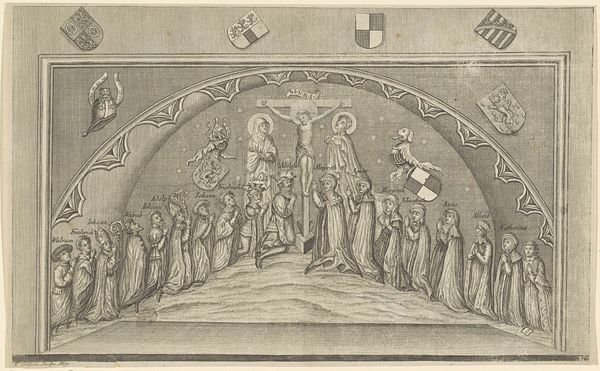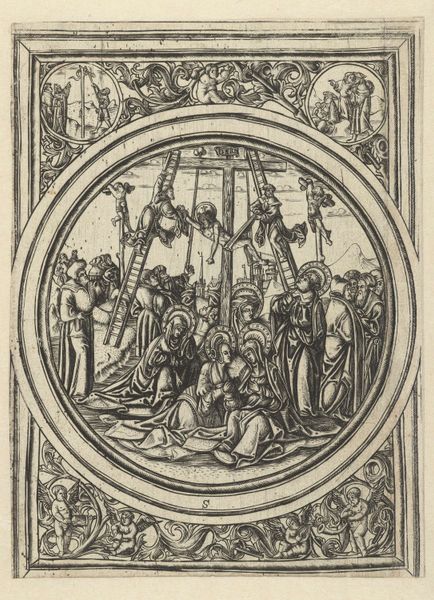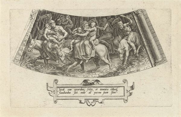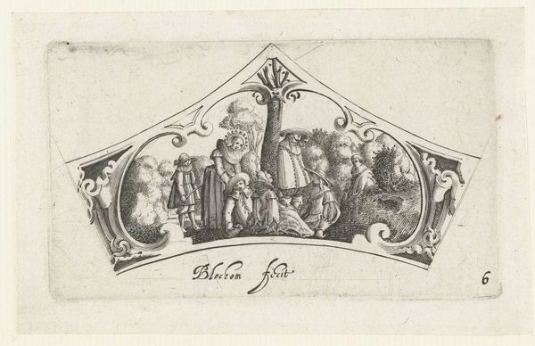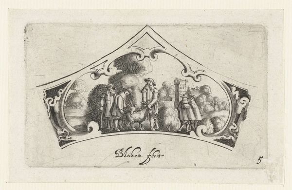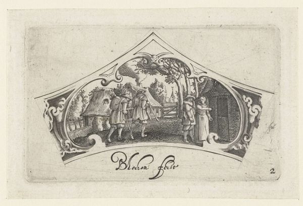 Bartholomeus van Lochom created this piece, titled "Women Assisting Drunken Men," using engraving techniques. Lochom was working during the Dutch Golden Age, a time of immense cultural and economic flourishing, but also stark social stratification. In this small print, we see two women guiding visibly inebriated men. This image offers us insight into the social dynamics of the 17th century, particularly regarding gender roles and the public perception of drunkenness. While men were often given a certain latitude for public intoxication, women were expected to maintain sobriety and decorum. The print's emotional resonance lies in its candid portrayal of vulnerability and care. Are the women acting out of compassion, duty, or perhaps a mix of both? It invites us to reflect on the expectations and realities faced by women in a patriarchal society and to question the narratives we construct around public behavior and private responsibility.