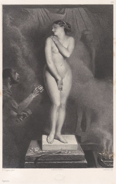 Curator: Here we have Adolphe Joseph Huot’s work, “Jonge naakte vrouw als ‘La Cigale’," thought to have been created around 1874. Editor: What strikes me is this pervasive stillness. It's an intimate, almost hushed encounter. The figure seems lost in contemplation, doesn’t she? Curator: Indeed. Consider the material aspects, though. It appears to be a light pencil work. You see, this reproduction method allowed for a wider distribution of images, reaching middle-class consumers eager to decorate their homes with art. Editor: Fascinating. I love the narrative suggestion. The drapery hints at classical forms, yet there is something raw about her vulnerability, wouldn’t you say? Curator: That rawness, or so-called “purity,” became quite fashionable during the late 19th century as representations of idealized feminine virtues increased in the art market. Remember, we also have the commodification of the female body operating within this aesthetic landscape. Editor: A good point. Even the stylized foliage whispers secrets—a pastoral scene crafted to evoke sentiment. Curator: The title “La Cigale” also offers key insight into its socio-economic implications, since, in French folklore, the cicada famously spends its summer singing before finding itself destitute once winter arrives. Editor: And, in this portrait, Huot perfectly renders her expression conveying that the coming winter looms near, both fearful and maybe hopeful? I can see now how it fits within a didactic narrative aimed to provoke thoughts of how people should behave to fit inside that society... Thank you for unveiling its background more plainly to me. Curator: Precisely. Through examining these works and their historical making, we shed light on the networks of exchange and value judgments surrounding art during that era. Editor: What seemed like a sentimental image has become now a thoughtful commentary of life conditions from 1874.