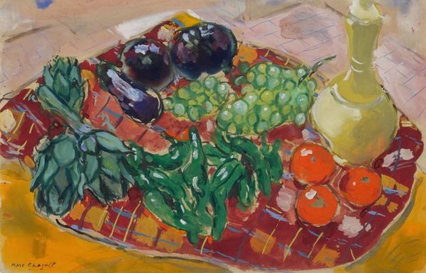 Curator: Avigdor Arikha’s painting "Chinese Vegetables," a modest oil on canvas, depicts just that: an assortment of uncooked Chinese vegetables laid out on what appears to be a table or counter. Editor: My first impression is one of simplicity. The vegetables are arranged almost haphazardly. The lighting emphasizes their individual textures and shapes. I find a peculiar sense of quietness about this piece. Curator: Given Arikha's background, specifically his experiences during the Holocaust and his later commitment to art that directly confronts reality, do you find the ordinary subject matter of the vegetables a purposeful decision to emphasize resilience of everyday life against the backdrop of historical trauma? Editor: An interesting thought. On the one hand, this painting is a rather straightforward representation, perhaps a study in form and light. Look how the brushstrokes follow the contours of each vegetable, carefully capturing the subtle shifts in color and shadow. He has clearly set up the composition so the tonal variations bring volume to simple shapes. The lettuce is more in focus at the bottom than are the cucumber or aubergine near the top of the plane. Curator: And isn't there something inherently political in choosing such humble subject matter? By portraying "Chinese Vegetables," might he be highlighting the cross-cultural connections, while subtly alluding to the experiences of displaced persons and their struggles to secure a place to belong, not least by referencing cultural fusion of cookery? Editor: Perhaps you read a little too much into the identity politics. This piece evokes in me something very primary in the experience of seeing. The visual pleasure afforded by simple form in simple combinations with direct access to rendering the play of shadow in this simple collection creates in me almost an erotic feeling that would likely contradict a politically-minded art theory. The forms alone can stand on their own. Curator: The question is whether an ostensibly simple presentation, with its direct unvarnished rendering, conceals layers of symbolism or perhaps subtle critiques of contemporary consumption and the globalization of food? Do you believe the vegetables may subtly point to contemporary cultural landscapes, especially those connected with international conflict? Editor: Maybe. I’m more drawn to the masterful way he employs the oil paint to describe form and light; in a sense his devotion to the real without further subjective comment makes this more appealing. Curator: I see what you mean. It also offers me insight into social relations and how we think about cultural assimilation. Editor: And for me, the artist delivers an almost understated brilliance by just observing these objects.