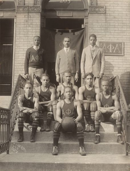 Curator: Here we have a photograph by Frances Benjamin Johnston, taken at the Hampton Normal and Agricultural Institute. It’s titled "Football Team." The inscription above the image is striking: "Agencies Promoting Assimilation of the Negro." Editor: The starkness of that text, contrasted with the hopeful faces of these young athletes, is incredibly poignant. There's a palpable sense of both pride and expectation radiating from the image. I wonder, what were Johnston’s intentions when she captured this scene? Curator: Johnston was commissioned to document the school’s activities. I think she was interested in capturing this moment of transition and integration—in this particular case, the "assimilation" of Black students through the sport of football. The picture plane is actually quite geometrically balanced when we consider the buildings and players. Editor: It almost feels like she wanted to showcase these young men as examples. A symbol, even. The composition, with the team posed so formally against the backdrop of the Institute, does seem to reinforce a narrative of order and progress. But there is also warmth and humanity in their expressions, defying any sense of cold objectivity. What strikes me most is the tension between the imposed narrative and the intrinsic dignity of the subjects. Curator: It's a layered piece, isn't it? I think that’s why it still resonates so deeply.