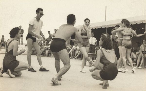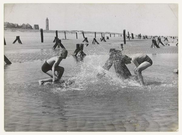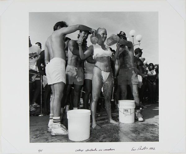 Editor: This gelatin silver print, "Coney Island, New York," was created by Sid Grossman between 1947 and 1948. The tightly packed figures create such an intense feeling of both intimacy and anonymity. How would you interpret this work? Curator: Notice how Grossman frames the scene. It's almost aggressively close, focusing on the texture and shapes of the bodies themselves. The image plane is densely packed; this is what gives it its visual tension. There’s little depth of field, minimizing the landscape and emphasizing the immediate forms. The grayscale emphasizes tonal contrast. Editor: That's fascinating! The focus on form over traditional compositional elements is very apparent. What purpose do you think this technique serves? Curator: It compels us to consider the work beyond the narrative of people at the beach. It's about the shapes, the juxtaposition of light and shadow, and how these formal elements communicate a certain rawness, an immediacy. Think about the way his cropped compositions deny any sense of depth of field. How does that limit or guide the viewers interpretation? Editor: By flattening the perspective, it pushes the human element forward, making it unavoidable. It’s not just about people at the beach; it is *about* the human form and its relationship with itself. Curator: Precisely. Consider the lack of posed subjects, we become observers not of an event, but an arrangement of abstract sculptural masses, each one made real by Grossman's attention to contrast and the subtleties of the silver gelatin print. Editor: I’ve never considered realism in such an abstract way. Thanks for highlighting how the material presentation interacts with our perceptions of form.