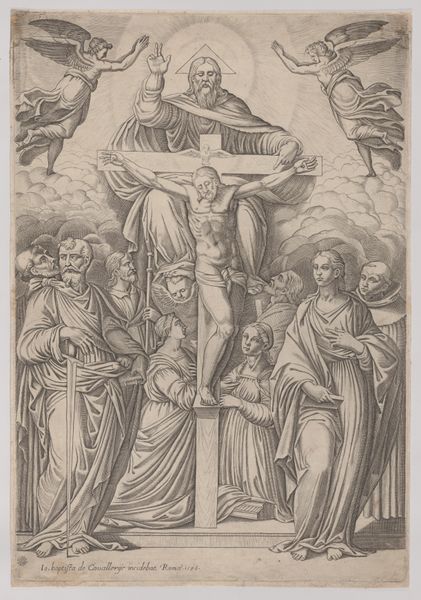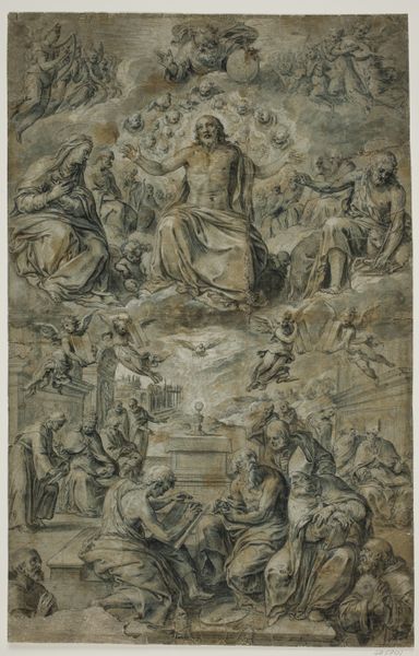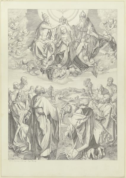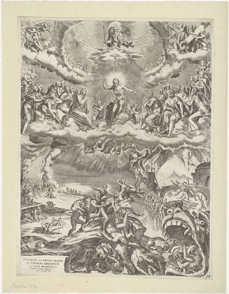 Curator: Well, here we have a photo reproduction of a drawing from Peter von Cornelius, titled “Fotoreproductie van een ontwerp naar het Laatste Oordeel van Peter von Cornelius in de Ludwigskirche, München." It's dated between 1857 and 1882, rendered in graphite and etching, reproduced as a print. Editor: Gosh, that's... intense. My first impression is a swirling mass of humanity – angels and sinners caught in this monumental, almost overwhelming scene. It's like looking into the abyss. There is so much going on, I would need some time to decipher all of it. Curator: It definitely presents a grandiose vision of divine judgment, fitting for its original context in the Ludwigskirche. This echoes the history-painting tradition and leverages strong allegorical elements. Reproductions like these played a key role in disseminating art and ideas to a wider public in the 19th century. Academic art really leaned into big statements like this! Editor: Absolutely. There's a definite sense of moral didacticism, the clear visual segregation of the righteous and the damned is… well, it is what it is. You almost feel like you know where you might end up even as you’re looking at it. It’s as effective as it is unsettling. The detail is fascinating, especially considering it's a reproduction of a drawing. I imagine the original mural must have been incredibly impressive. I wonder how much this medium influenced the reception of his vision. Did it sanitize it in any way? Or did it enhance it, perhaps make it more reproducible and therefore have a wider impact? Curator: That’s the power of reproductions. Carlo Naya helped make these images accessible beyond Munich. This would permit a deeper study outside the specific confines of the church. Seeing it decontextualized may give people the opportunity to critically interpret a social order in its totality and to assess art’s place in the broader sociopolitical landscape. Editor: And that's the tension of these big moralizing pieces. It holds up a mirror but also shapes the reflection. I'm glad for both of our views on this today, as it makes me reflect on how this vision remains impactful, though our context differs vastly from when this image came into being. It speaks of perennial human desires for order.