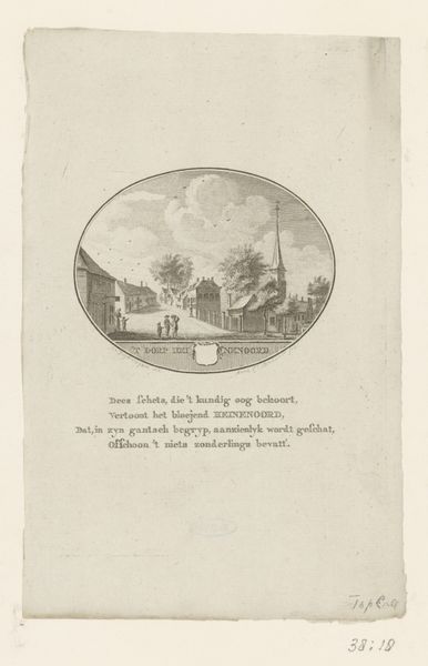 This print, titled "Gezicht op het ambacht Hoog- en Woudharnas" was made by Anna Catharina Brouwer. The image shows a village scene, rendered with fine lines that convey the textures of nature and architecture. As a print, this work belongs to a lineage of reproductive technologies, enabling mass distribution and exchange. The lines and hatching create tonal variations, giving depth to the composition. The act of printing transforms the original drawing into multiple identical copies, each bearing the mark of the printing press. Prints like these were often made for commercial purposes, to promote the virtues of rural life and local products. The inscription below the image praises the area for its beautiful fields and delicious butter, linking the visual representation with economic value. This connection highlights how artistic production was intertwined with broader issues of labor, trade, and consumption in Dutch society.