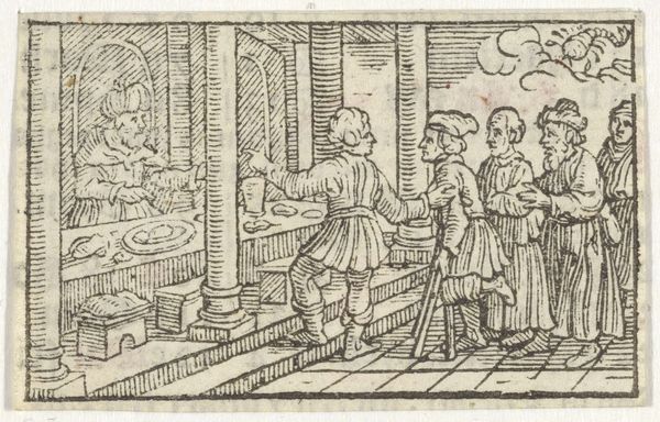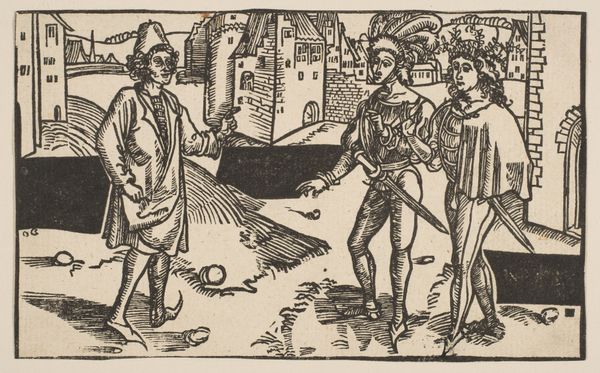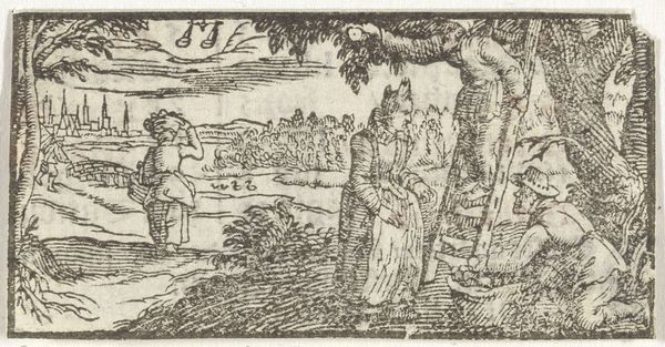 Editor: Here we have "December," a 17th-century engraving by an anonymous artist. It depicts figures walking towards a distant city, and a labourer trudging away, and, well, I’m immediately struck by the contrast between the well-dressed figures and the burdened one. How would you interpret this scene? Curator: This small print vibrates with cultural memory, doesn't it? The artist uses imagery that carries potent emotional and psychological weight. Think about the visual shorthand at play. Do you notice the footprints suggesting a well-worn path, perhaps indicating the cyclical nature of labor and life itself? Editor: I do now that you mention it. Is that meant to mirror something larger, symbolically? Curator: Absolutely! In iconography, we are constantly decoding layers of meaning. Notice how the figures moving towards the city seem oblivious to the struggles of the worker, perhaps a statement on social stratification. The burdened labourer, walking away under the bare tree—could he be enacting a long-held myth or cultural anxiety? What stories resonate with you as you view him? Editor: Hmm, maybe the archetype of the wandering outcast or even a scapegoat? He's visually separate from the others. It feels like a poignant image of societal division. Curator: Precisely. The landscape itself isn't neutral either; it is coded. The city represents opportunity but also distance and perhaps unattainability for some. This engraver, consciously or not, is participating in a conversation that stretches back centuries, using symbolic language to comment on the human condition and who belongs where. What does ‘December’ itself conjure for you, regarding symbolic weight? Editor: Reflection and closure. It definitely makes you think. Thanks, this was eye-opening. Curator: It has been a pleasure, there’s a potent visual memory imbued in every stroke here!