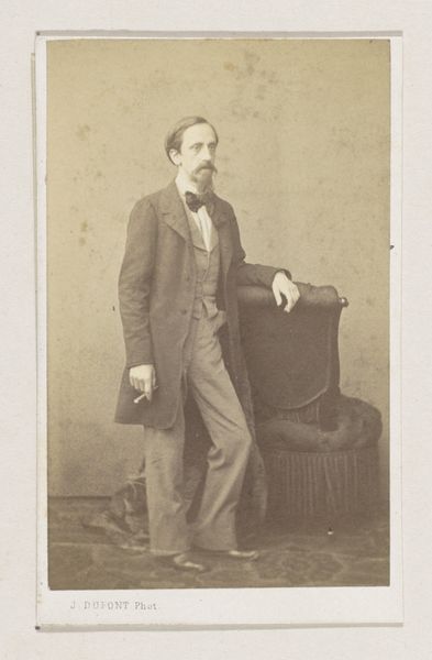 Joseph Dupont made this photographic portrait of the painter Joseph Bellemans sometime in the mid-19th century. The photograph offers insight into the visual codes of bourgeois masculinity in Belgium at that time. The neatly trimmed beard, dark suit, and bow tie signal the sitter’s status and respectability. As photography gained popularity, it served as a powerful tool for constructing and disseminating social identities. Dupont's inscription of 'Phot' at the bottom left indicates that the photograph was made in a commercial studio. This reflects how photography became increasingly tied to the burgeoning consumer culture. The painter's hat is left casually on the ornately decorated chair, hinting at the sitter's profession while subtly underscoring his elevated social standing. To fully understand this portrait, further research into the Bellemans' career within the Belgian art world, as well as the history of Dupont’s studio, would be useful. It would also be helpful to consider the place of photography within the institutions of fine art at the time.