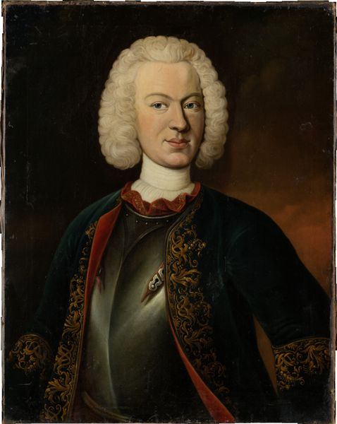 Curator: This painting, housed here at the Städel Museum, is a portrait of Justinian von Holzhausen, dating to around 1735 to 1745. It is done in oil. Editor: It strikes me as surprisingly amiable for a formal portrait. Look at that almost amused expression! Is it just me, or does he look like he's about to share a delicious secret? The warmth of the red fabric and the twinkle in his eye—it all reads as very human. Curator: Yes, it departs a bit from the stern conventions of Baroque portraiture, doesn't it? Typically, those in portraits wished to convey their status or power, perhaps through imposing scale or austere symbolism. Yet, observe the buttons: they echo wealth and sophistication while still presenting a subtle nod to societal standards. He wears his wealth; it does not wear him. Editor: Absolutely. The textures—the sheen of those buttons, the almost conversational swirl of the wig—they draw you in. Also, there is the very relaxed gesture of his hand, resting almost casually over the draped red fabric. There’s a dynamic energy; it feels less like a static presentation and more like a brief pause in a longer conversation. It avoids that common stiff posture of formality we often see! Curator: Precisely. While some may interpret the relative simplicity of the dark background as lacking the allegorical complexities prevalent in other baroque works, I see it as drawing a focus back to the individual. What we perceive is less a representative symbol and more the psychology of the person depicted. It creates an unusual, refreshing sense of intimacy. Editor: Which leads me back to his expression. It humanizes everything! Maybe I would ask him if I could paint him while wearing roller skates! I’m very glad that someone chose to preserve his likeness so many centuries ago, in this way. There’s something truly refreshing in finding the familiar in those removed by time. Curator: I agree. What resonates is this sense of connection. Though history casts a long shadow, art such as this makes palpable the common threads that tie us together through time. We have reached out today and touched a man’s character preserved from the past. Editor: Wonderful. It does show a bit of optimism in its smile.