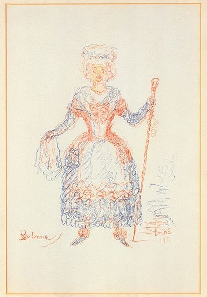 James Ensor made this drawing called "Fifrelin" with pencil on paper, and what strikes me is its quiet strangeness. The marks are gentle, almost hesitant, creating a figure that seems to emerge from a dream. The light yellow palette, punctuated by these soft red hearts, feels both whimsical and a little melancholic. It's like Ensor is thinking aloud, letting the image unfold through the act of drawing. Look closely at the way the lines create the costume. They are tentative and slightly unfinished. It reminds me that art isn't about perfection, but about the process of searching, of finding form through a series of marks. Ensor's drawing feels like a dance between control and chance, a glimpse into the artist's mind as he works out the shape of his imagination. This drawing speaks to the strange beauty that can emerge when we embrace uncertainty. This feels like a drawing by Alfred Jarry, or maybe even a proto Paul McCarthy, those kinds of sensibilities.