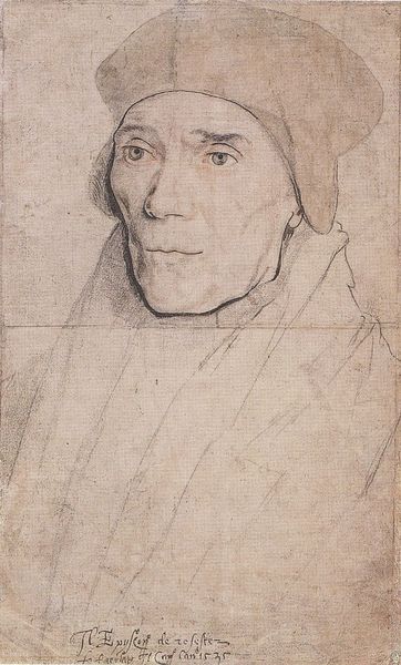 Curator: This intriguing image here at the Rijksmuseum is titled "Fotoreproductie van een portret van William Warham door Hans Holbein." It’s labeled as being from before 1877. What catches your eye initially? Editor: Well, the overall tone is somber. The light pencil work against that toned paper lends an almost ghostly feel. It reminds me of historical documents, like faded letters with secrets held within. Curator: Indeed. Let's delve into that “toned paper” aspect. Someone, perhaps in the throes of artistic practice, elected a warm ground here. Do we assume they salvaged aged paper or deliberately manufactured it? Consider also: the cost of labor implied to realize a simple graphite image such as this in the 19th century! Editor: Right. Material reality. Now I want to zoom in on the sitter himself. William Warham. What about the hat? It's less elaborate than you might expect for an Archbishop, right? Its subdued presence makes me wonder what this choice would have symbolized at the time of its original creation. Curator: Exactly. He served as the Archbishop of Canterbury. Now, even though this is a photomechanical reproduction made fairly late, it shows that even in this industrial process, Holbein’s portrait still held cultural value worth replicating and disseminating. Editor: Which loops us back to Warham himself! What was so significant about him that his image persists? What qualities were artists hoping to distill through replicating Holbein's rendering? Curator: Consider the original circumstances under which the original sketch was made and how that contrasts against this later photomechanical version: these reproductive technologies were revolutionary because they rendered fine drawing into commercial product! It served the burgeoning market of reproductions and, consequently, impacted the perception of labor in the visual arts. Editor: It truly encapsulates how an image can echo through time. Its very existence speaks to the power of symbols to transcend not just decades, but technologies too. Curator: Absolutely. Reflecting on it, examining this image makes us consider our relationship to process as well as those reproduced historical figures. Editor: Precisely. These portraits are far more than just likenesses, right? They really are material and cultural artifacts reflecting social and ideological currents that are constantly moving and shifting.