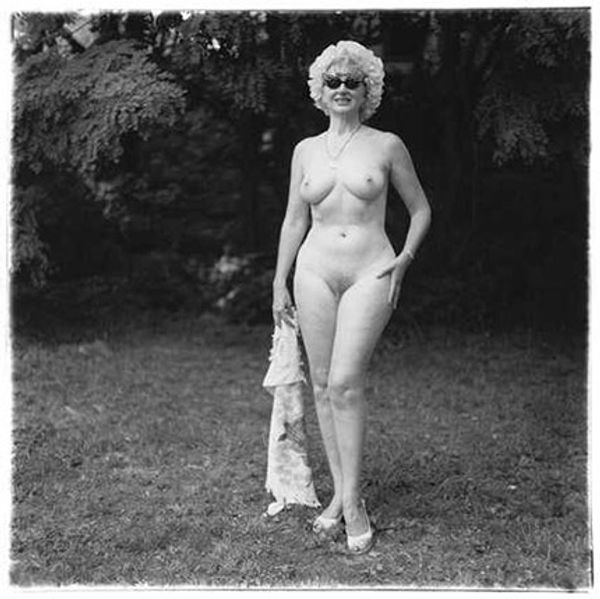 Curator: Larry Fink's black and white photograph, "Girls on Porch—Martins Creek, PA", certainly captures a raw, unposed moment. What is your first take? Editor: The composition strikes me. The contrast between light and shadow is extreme and the scale is somewhat unsettling, with the laughing woman so close to the viewer. Curator: Fink often explores social dynamics through his lens. Consider the setting—Martins Creek, Pennsylvania. It's a working-class environment and he's showing us a slice of life, free from glamor. Editor: Precisely. The graininess and high contrast contribute to that documentary feel. It's a far cry from polished studio portraiture. I find it interesting how Fink uses tonality to emphasize the figures. Curator: He isn’t afraid to confront class, labor, and leisure. It’s all about who is represented, and how—the making of the art itself. Editor: Ultimately, Fink presents a study in form and emotion. Curator: An image speaking volumes about everyday lives and our relationship to them.