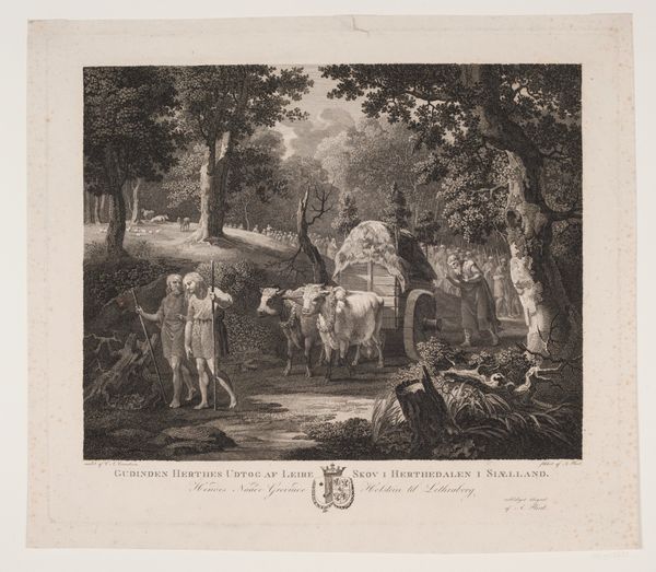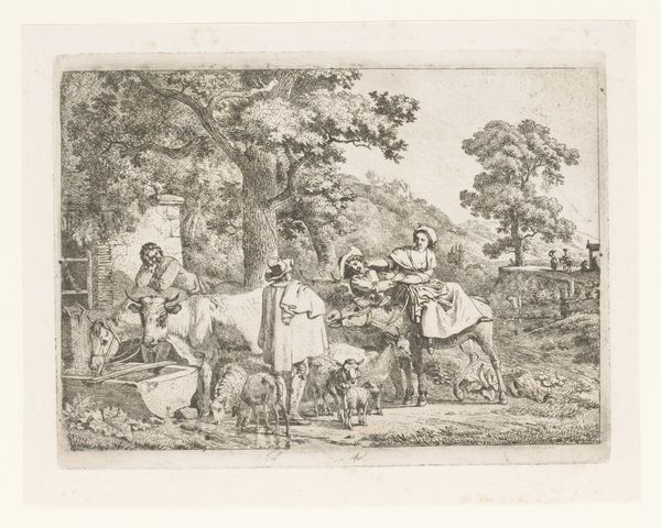Curator: This is "The Prospect" by Louis Crépy, a print held here at the Harvard Art Museums. It presents a gathering of figures within a landscape. Editor: It feels theatrical, almost staged. The figures are posed, and the light guides your eye through the trees to what looks like a grand house in the distance. Curator: The print's title speaks to that intended view, directing our gaze towards the architecture. It’s interesting to consider how this manufactured perspective mirrors the social order of the time, particularly the gaze of the elite. Editor: Absolutely. And it's also intriguing to think about how art like this shaped people's perceptions of nature and leisure, perpetuating certain ideals. Curator: Indeed. This work reveals a complex interplay between nature, culture, and social power, which gives us a great deal to reflect on. Editor: It reminds us that even seemingly idyllic scenes can reveal underlying power structures.