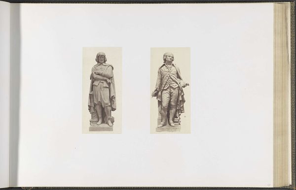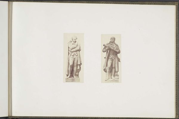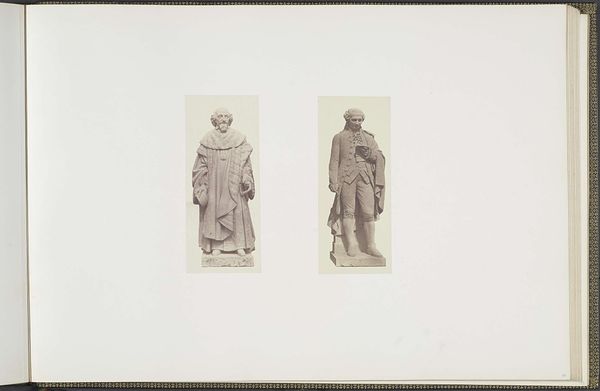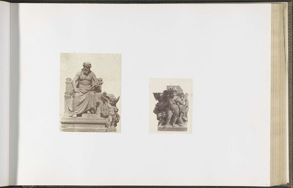 Edouard Baldus created this photograph titled 'Gipsmodellen voor beeldhouwwerken op het Palais du Louvre' without a specified date. The image features two plaster models of sculptures, 'La Céramique' and 'La Médecine,' each captured with a stark, documentary gaze. Baldus's approach emphasizes the structural elements of the sculptures, highlighting their forms through careful manipulation of light and shadow. The composition is deliberately formal, inviting a semiotic reading of the sculptural elements. Each figure and its accompanying attributes function as signs, pointing to broader cultural values and ideas. 'La Céramique,' with its vessels and tools, signifies craftsmanship and artistry, while 'La Médecine,' surrounded by symbolic flora, embodies healing and knowledge. Baldus uses the photographic medium to dissect and present these symbols, thereby engaging in a dialogue about representation and the role of art in reflecting societal ideals.