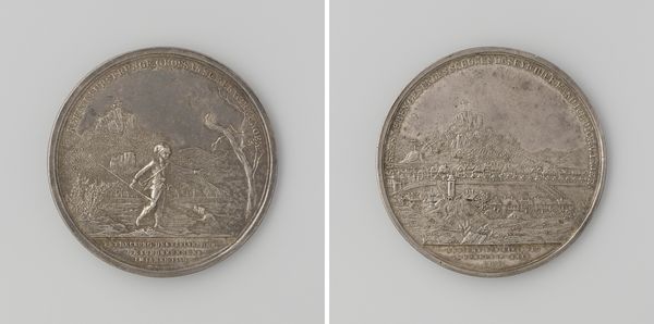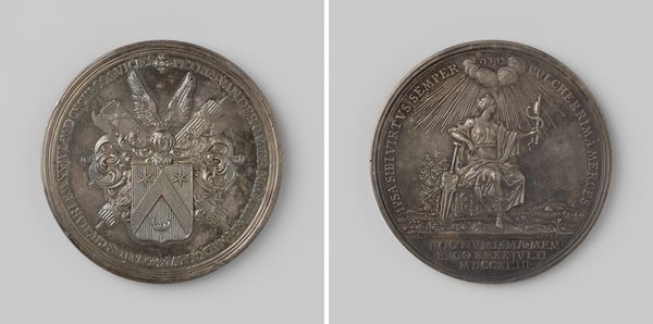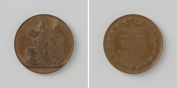 Editor: This is a commemorative medal, "Wereldtentoonstelling te Antwerpen 1894," celebrating the World's Fair in Antwerp, designed by Alphonse Michaux. It seems like it’s made of metal, likely bronze or a similar alloy. I'm struck by how it combines industrial and allegorical imagery. What symbols or historical references do you see here? Curator: Well, at first glance, the female figure dominating the medal is likely an allegorical representation of progress or industry, bearing a torch – a potent symbol of enlightenment, knowledge, and societal advancement. Note how the buildings, possibly representing pavilions from the fair, are juxtaposed against her flowing drapery, evoking a classical aesthetic. Do you notice how the artist combines a modern setting within a more timeless, allegorical context? Editor: Yes, the combination feels intentional. The ships in the background contrast with her classical style, highlighting technological advancements. What about the symbols on the reverse side with the coat of arms? Curator: The coat of arms is rich with cultural memory! Such symbols often reveal localized significance and claims to historical legitimacy. Can you decode what this emblem meant to the city and region in 1894, a time of significant political and social change? What do such emblems communicate about regional pride? Consider how this connects to ideas of nationhood. Editor: I hadn't thought about the nationhood aspect so explicitly before. The combination of local symbols and international achievements gives a nuanced perspective to the city's place in the world at that time. I wonder how folks from other countries interpreted it? Curator: Precisely. Consider how it presents Antwerp to the world – both rooted in tradition and embracing modernity. The medal isn't merely a souvenir but a carefully crafted message, embedded with symbolism to tell a complex story. The laurels at the bottom indicate honour, success, triumph... They surround the historical significance of that period. Editor: I will never look at medals the same way again; thank you for your detailed analysis!
