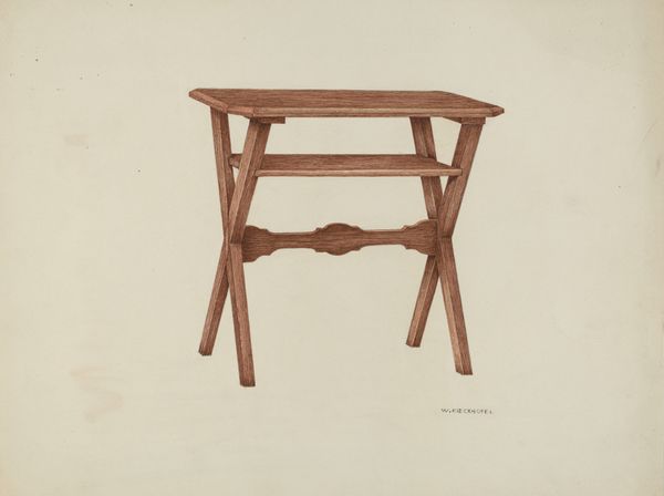 Editor: This watercolor and drawing by Harry Mann Waddell, called "Cider Press" and created around 1940, it is quite charming! The subdued tones and precision give it an almost diagrammatic feel. How would you interpret the piece? Curator: What I see is a record of human ingenuity, a symbol of labor and transformation. Consider how such a tool represents not just the pressing of apples, but the pressing of culture, the cyclical nature of the harvest, and the human relationship to the land. The cider press becomes a cultural artifact. Editor: That's fascinating! I hadn't thought of it as having so much depth. The visual of the screw intrigues me... Curator: Yes! Note the deliberate and strong line Waddell uses to define it. The screw itself is an ancient symbol found across cultures representing order, movement and directed power. In this piece it drives the transformation from raw fruit to drink. Is that all it implies, or perhaps is Waddell using it in other symbolic ways? Editor: It brings a potent, grounded, practical quality to the piece. It's humble yet undeniably present! Curator: Exactly! And how does this simple object speak to broader themes of sustainability, tradition, and the local? Could this piece be a comment on those ideas during a time of immense change? Editor: I hadn't considered the sustainability aspect. The cyclical process of cider making... it's much more than just a still life, or documentation. Curator: Precisely! This artwork makes me appreciate the intersection of the object, memory, and the cyclical passage of time that informs how we attach meaning to objects. Editor: I'll certainly look at everyday objects differently after this!