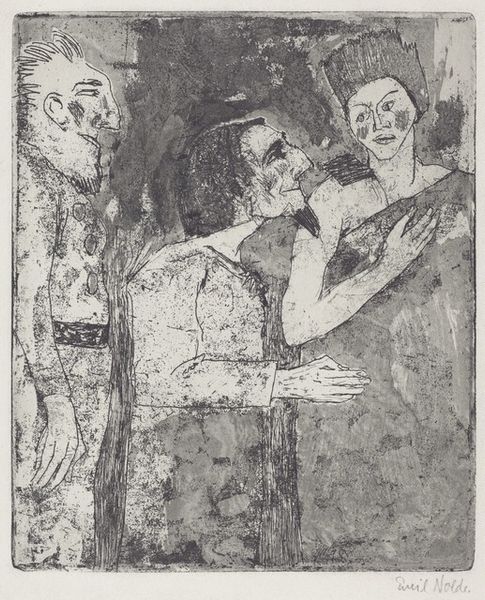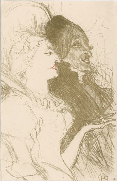 Henri de Toulouse-Lautrec made this lithograph, "At the Opera: Mme. Caron in 'Faust'," using delicate strokes and a muted palette that evokes the hushed atmosphere of a theater. The composition is stark, focusing sharply on the figure of Mme. Caron. The rough, unfinished quality of the lithographic lines invites us to consider the nature of representation. We're not given a polished portrait but rather a fleeting impression of a performer caught in a moment of intense emotion. This rawness challenges classical ideals of beauty, aligning with the avant-garde's interest in authentic, unvarnished depictions of modern life. The stark lines against the pale ground emphasize a sense of unease, reflecting late 19th-century anxieties about identity and appearance. Lautrec's choice of lithography—a medium inherently tied to reproduction and dissemination—questions the idea of art as a unique, precious object. The print becomes a commentary on the mass production of images and the democratization of art, which speaks to the broader social shifts of his time.