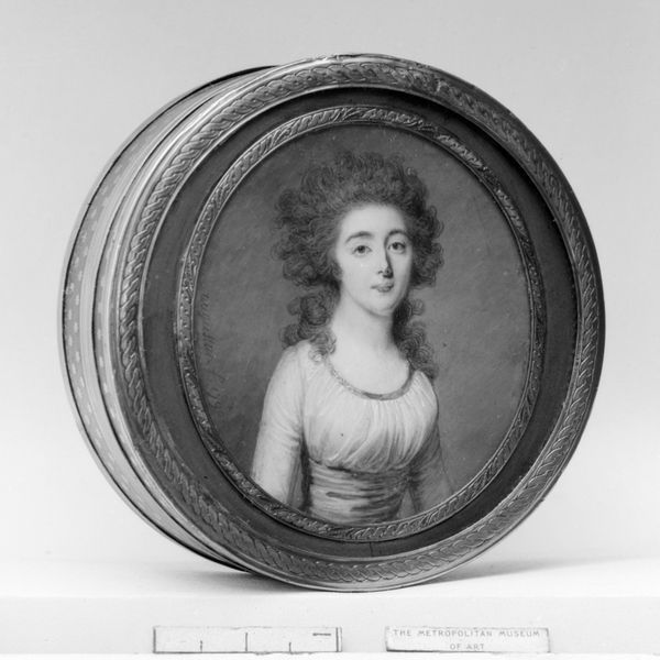 Curator: Upon first viewing, the swirling composition evokes an ephemeral sweetness—the high-key palette, the round frame, and the intimate scale contribute to this impression. Editor: Indeed, it’s a particularly charming example of rococo portraiture, rendered as a miniature. The artwork is titled "A Lady in a Spanish Dress Playing the Mandolin," crafted in 1789 by Cornelius Høyer. It’s rendered in paint on ivory and is currently housed in the Statens Museum for Kunst. Curator: The subject’s gaze directs us back into the composition in a masterful way. The placement of her fingers upon the strings of the mandolin suggests that moment before a chord is struck. One could almost map this image with signs denoting gesture, clothing, and object. Editor: Quite right. The mandolin itself is potent with connotations. Beyond its association with aristocratic leisure, in period iconography the mandolin appears frequently, often signaling a woman's artistic inclinations and refined sensibilities, or the influence of Italian culture on the era. Curator: Consider also the interplay between the circular format and the swirling dress folds. These contrasting curves serve to draw our eye around the image. Editor: Speaking of which, that "Spanish dress," although it’s likely more theatrical than authentic, conjures a playful exoticism so beloved during this period. There is that desire to reach for cultural artifacts far removed from the sitter’s everyday world, while hinting at the cultural capital one must possess to recognize those far-off lands. Curator: Yes, and the feather-trimmed hat acts as an additional visual device to elevate the figure. Though minimal in scope, Höyer creates an upward direction for our eye through compositional structures alone. Editor: Ultimately, it's fascinating to see how this small ivory circle encapsulates so much about identity, status, and cultural fascination in the late 18th century. Curator: An elegant artifact demonstrating a keen mastery of representational structure and composition.
