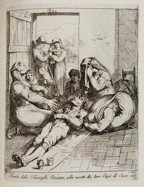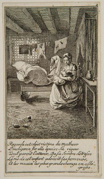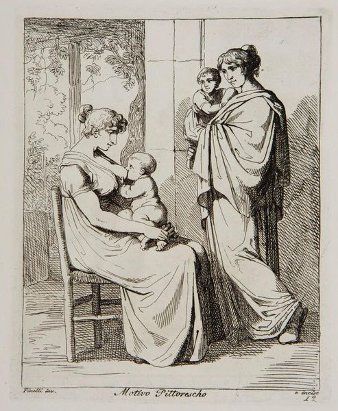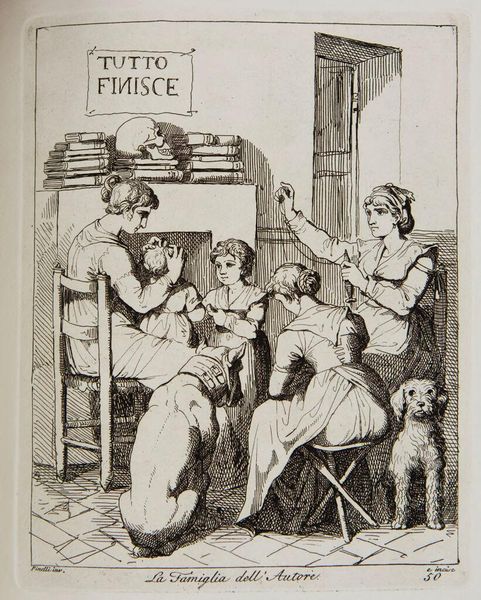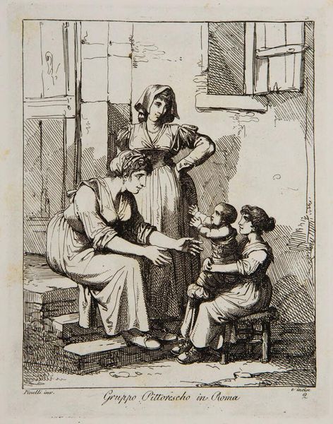 Editor: So, this is "Group Caught in a Moment of Truth" by Bartolomeo Pinelli. It’s an etching. I’m struck by how ordinary it feels, like a snapshot of daily life. What do you see in this piece? Curator: It’s interesting you say that. To me, it feels like a stage set, not entirely real. Pinelli was known for his theatrical flair. See how the figures are arranged? Almost like actors. The "truth" here, I suspect, is a performance. Editor: A performance of domesticity? Curator: Precisely! Or perhaps a gentle satire of it. What do you make of the dog, so central in the composition? Editor: It's like he's in on the joke! I never considered the staged aspect before. I always thought it was just a simple scene. Curator: Art always gives more when you look beneath the surface.