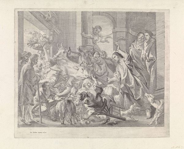 Editor: Here we have Daniel Chodowiecki’s 1775 engraving, "The Right of the Masked." It seems to depict a crowded social scene. The mood feels almost frantic, chaotic. What social commentary do you think Chodowiecki is offering with this piece? Curator: I think you’ve picked up on something important – the apparent chaos. What if we interpret the masks not just as disguises, but as symbols of a societal structure that permits – even encourages – certain behaviours under the veil of anonymity? Think about how gender and class play into this…who is afforded the “right” to such behaviour, and who is vulnerable? Editor: So, the masks aren’t just for fun, they’re indicative of power dynamics? Is Chodowiecki suggesting the masked are somehow taking advantage of their positions? Curator: Precisely. Consider the era. This print was made during a time of growing social unrest, where traditional hierarchies were being questioned. The ‘right’ alluded to in the title may be more ironic than literal. How do you think his choice of the etching medium, with its linear precision, contributes to this social critique? Editor: That’s interesting. I guess the detailed line work sort of emphasizes each individual's role within the larger societal structure that you mentioned, and the chaotic composition is an intentional critique. It makes you think about what remains hidden or obscured, just beyond the lines. Curator: Absolutely. And doesn’t it encourage us to consider those who are *not* in the throng - the marginalized, the unmasked, the ones without that so-called ‘right’– to reflect on their relative positions, and their power within society at that time? Editor: I’d never considered the "right" as ironic. Thanks, that gives me a lot to think about regarding social power at the time, and, honestly, today as well. Curator: Indeed. Art invites us to make these kinds of connections, and that, I think, is where its true power resides.