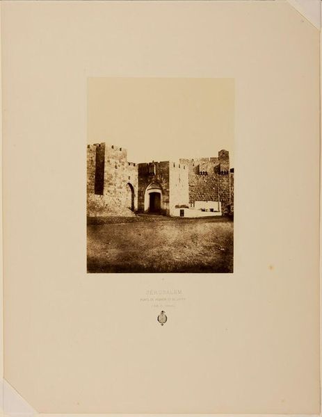 Editor: This is Louis de Clercq's "Damascus Gate, Jerusalem." It's a photograph, and I'm struck by the weight of the stone and the deep shadows. What enduring symbols do you observe within the structure of this gate? Curator: The gate itself, a recurring motif in art, signifies transition, access, and power. The semi-circular arches, a Roman legacy, speaks of enduring empire and the passage of time. Do you see the circular decorations? Editor: Yes, I do. Are they common? Curator: These are likely rosettes, ancient symbols of protection and perhaps divine blessings. The image resonates with layers of cultural memory, doesn't it? Editor: It really does. I see how the weight of history shapes even a single stone. Curator: And how a photograph captures it all.