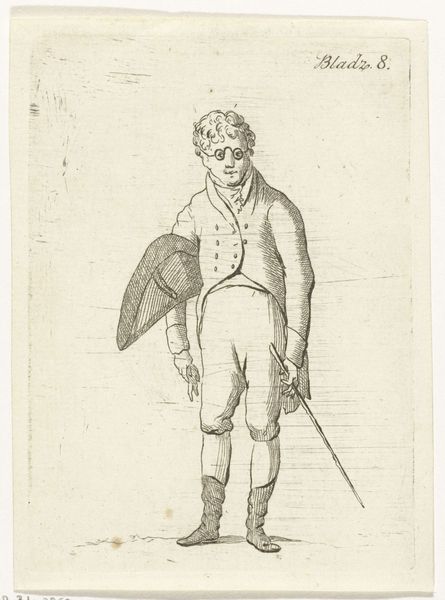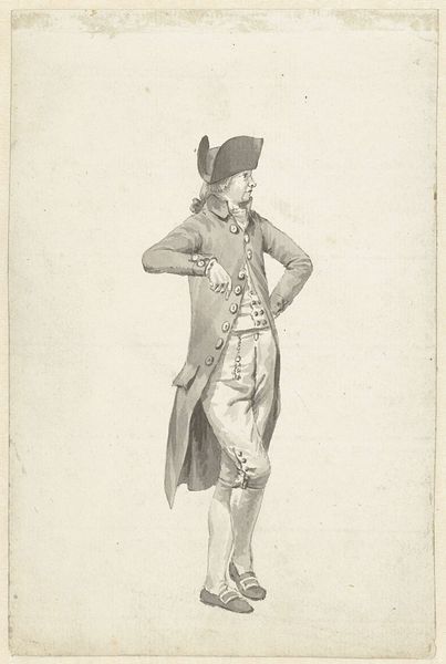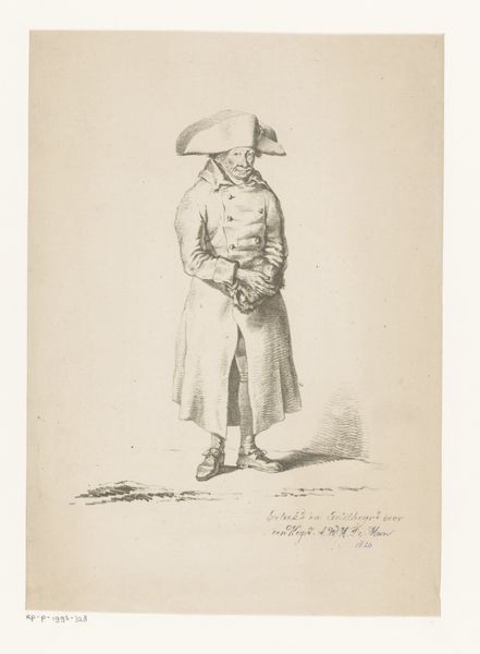 Editor: This drawing, "Studie van een staande man met lange jas en wandelstok" made with pencil in 1818 by Cornelis Steffelaar, depicts a man with a long coat and walking stick. It seems like a preparatory sketch for something larger. What stands out to you when you look at this drawing? Curator: What interests me is the physical making of the image, how the labor involved in producing this type of drawing can highlight aspects of class and social status in 19th-century Dutch society. Consider the ready availability and low cost of pencils and paper compared to say, oil paints. Editor: That's interesting. So you're saying the choice of materials speaks to the subject's status? Curator: Partially. Think about who would commission, create, and consume such a portrait. The very act of depicting this man using readily available materials implicates the artist, patron, and sitter in a specific social web. Were the sitter and artist working under the constraints of material circumstances? What would compel someone to capture and consume a portrait made this way versus any other form? Editor: I see what you mean. It makes me think about the function of portraits in different social classes and the economics behind artistic materials. I hadn’t considered that before. Curator: Exactly! How does mass production and consumption influence who gets seen and how they get seen, in our digital and analog worlds? Thinking about production shapes what we see and what we learn to value, doesn't it? Editor: It definitely changes my perspective. I’ll be paying more attention to the materials and processes artists use from now on!