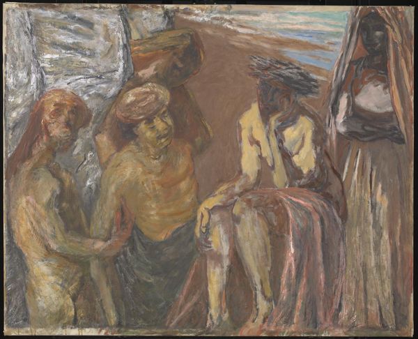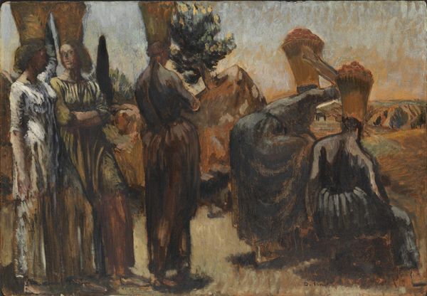 Editor: This is Albin Egger-Lienz’s “Reapers in a Gathering Storm,” created in 1912 using oil paint. The colors are so dark and earthy; it feels somber and heavy, like the storm is pressing down on these workers. What stands out to you most? Curator: The bent postures and close cropping give this a monumental feel. It reminds me of the poses of the damned in late medieval depictions of the Last Judgement, but instead of angels and devils, there is just raw, back-breaking labor. Do you think the artist intended to connect these peasants with some historical archetype of toil? Editor: I can see that. There's something timeless about the struggle they portray. The hats obscure their faces, dehumanizing them almost, reducing them to just their labor. Curator: Precisely! The facelessness acts as a potent symbol. These aren't individual portraits; they’re archetypes of the working class, bound by the never-ending cycle of labor. How do you feel the 'gathering storm' impacts our reading of this symbol? Editor: It amplifies the feeling of dread and inevitability. It's like they're trapped, not just by their work but also by this impending disaster. Nature and labor… both unforgiving. Curator: Yes, nature becomes a symbol of larger, inescapable forces—social, economic, even spiritual. There is very little sense of hope to be found in this composition, only acceptance of one's fate. Editor: It’s interesting how the title adds another layer to what might seem a simple scene. It pulls so much more out of the visual elements. Curator: Absolutely. Words, just like symbols, give weight and resonance to what our eyes initially perceive. We start to recognize the weight of generational farming; these are more than just people toiling. Editor: This makes me see beyond the surface – the symbolic weight transforms the figures into representations of perseverance under duress. Thank you.